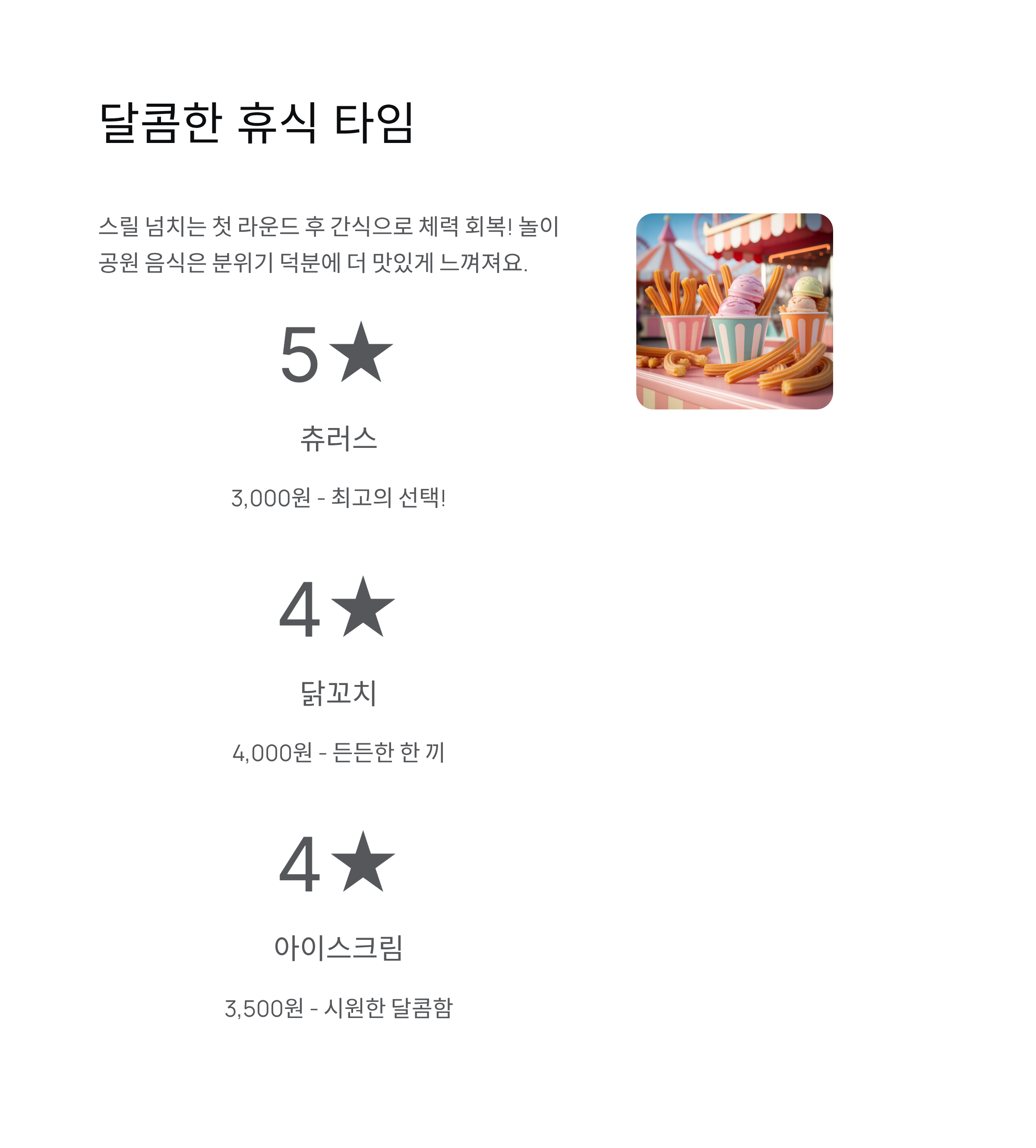 놀이공원에서 먹는 음식은 이상하게 더 맛있게 느껴지지 않나요? 분위기 덕분인 것 같아요.
