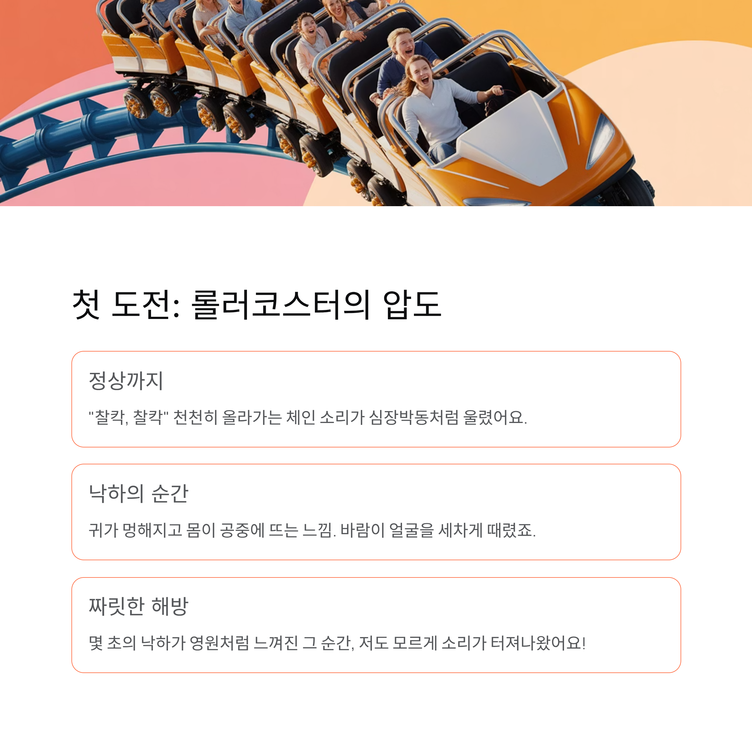 드디어 제 차례. 안전바가 내려오고 천천히 올라가는 롤러코스터의 체인 소리가 시작됩니다. "찰칵, 찰칵" 그 리듬이 어쩐지 심장박동과 같았어요.