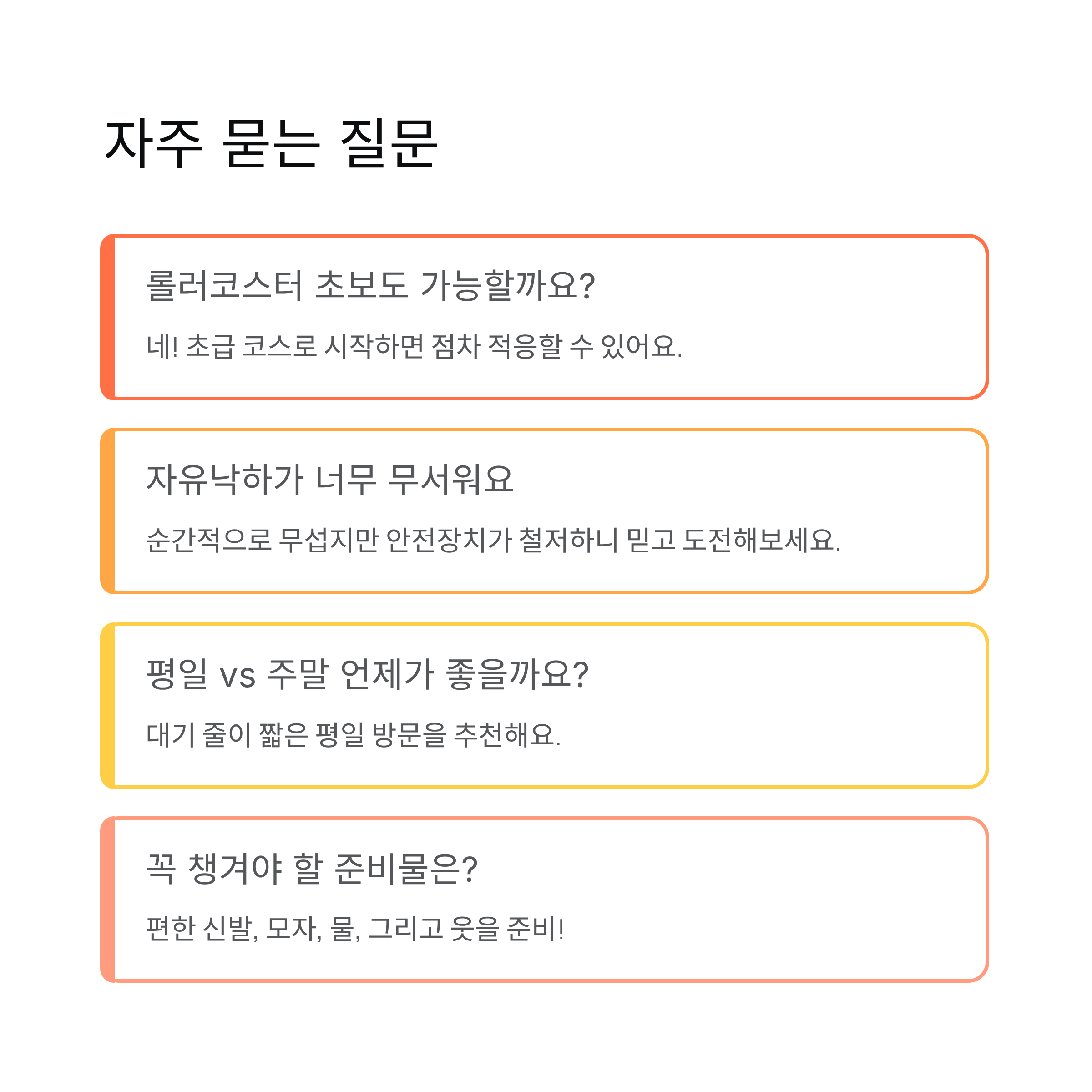 | 롤러코스터 초보도 탈 수 있을까요? | 네, 초급 코스로 시작하면 점차 적응할 수 있어요. |