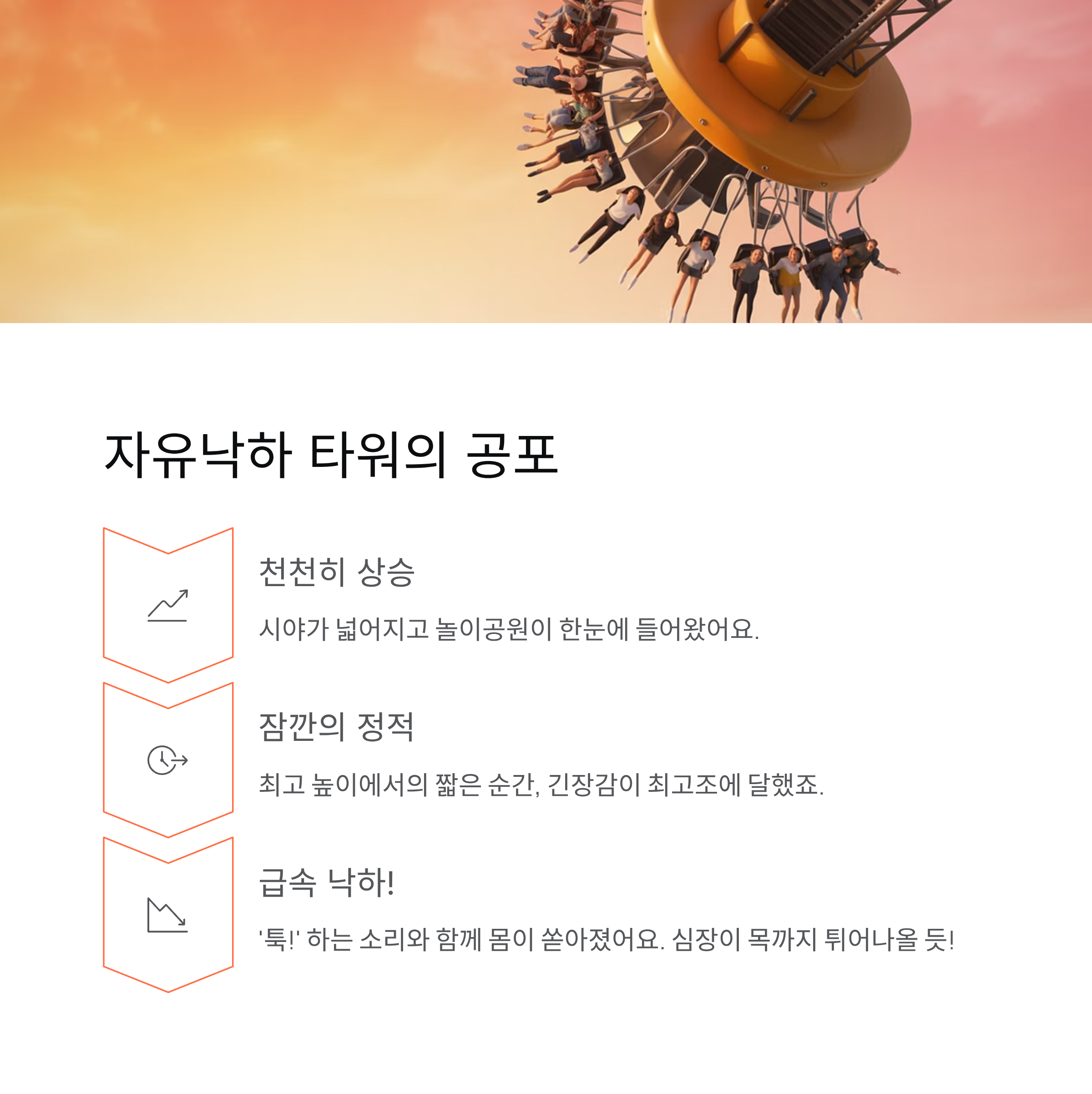 갑자기 ‘툭!’ 하는 소리와 함께 몸이 아래로 쏟아졌습니다. 바람이 얼굴을 가르고, 심장이 목까지 튀어나올 듯한 느낌!