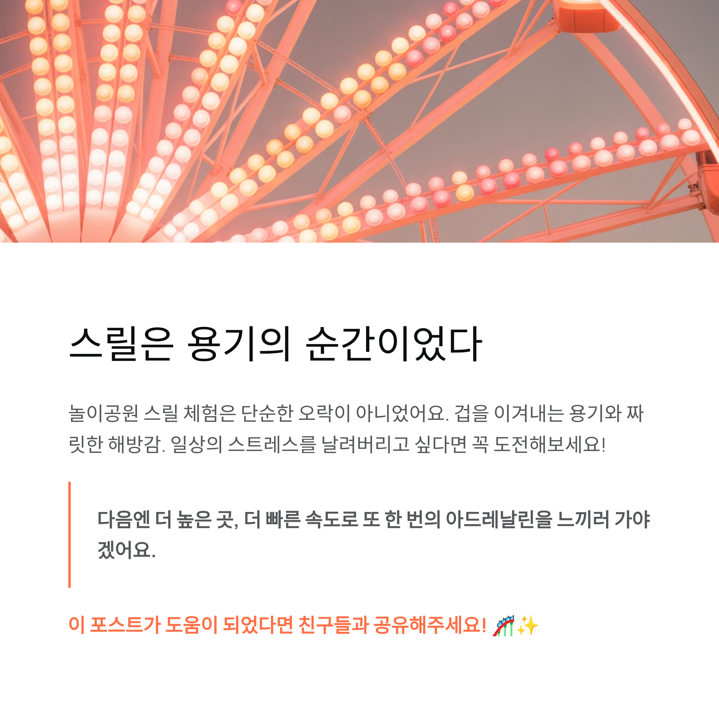 하루쯤은 일상을 벗어나 심장이 터질 듯한 짜릿함을 느끼고 싶을 때가 있죠. 저는 얼마 전 친구들과 함께 놀이공원으로 떠났어요. 단순히 놀러 간 게 아니라, ‘스릴 체험’을 제대로 즐겨보자는 목표로요. 긴장과 기대가 섞인 그 하루는, 정말 아드레날린이 솟구치는 순간들의 연속이었답니다. 오늘은 그 생생한 체험기를 담아, 놀이공원에서 느낄 수 있는 진짜 스릴의 세계를 함께 나눠볼게요.