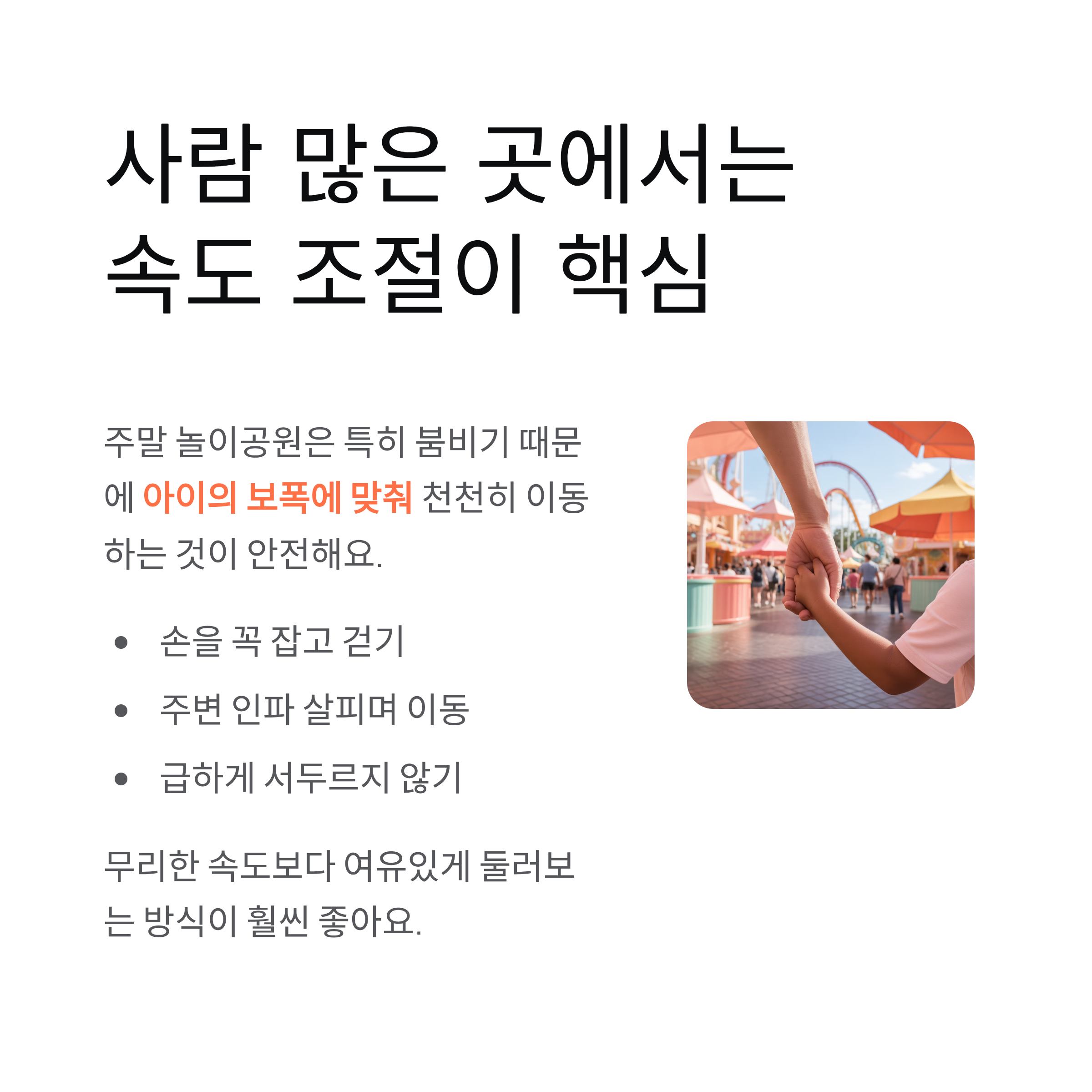 놀이공원은 주말이면 특히 붐비기 때문에 아이의 보폭과 속도에 맞추는 것이 안정적이에요. 아이가 주변을 살피기 어려운 상황이 많아 손을 잡고 이동하면 안전하게 동선 관리가 됩니다. 무리한 속도보다는 천천히 둘러보는 방식이 좋아요.