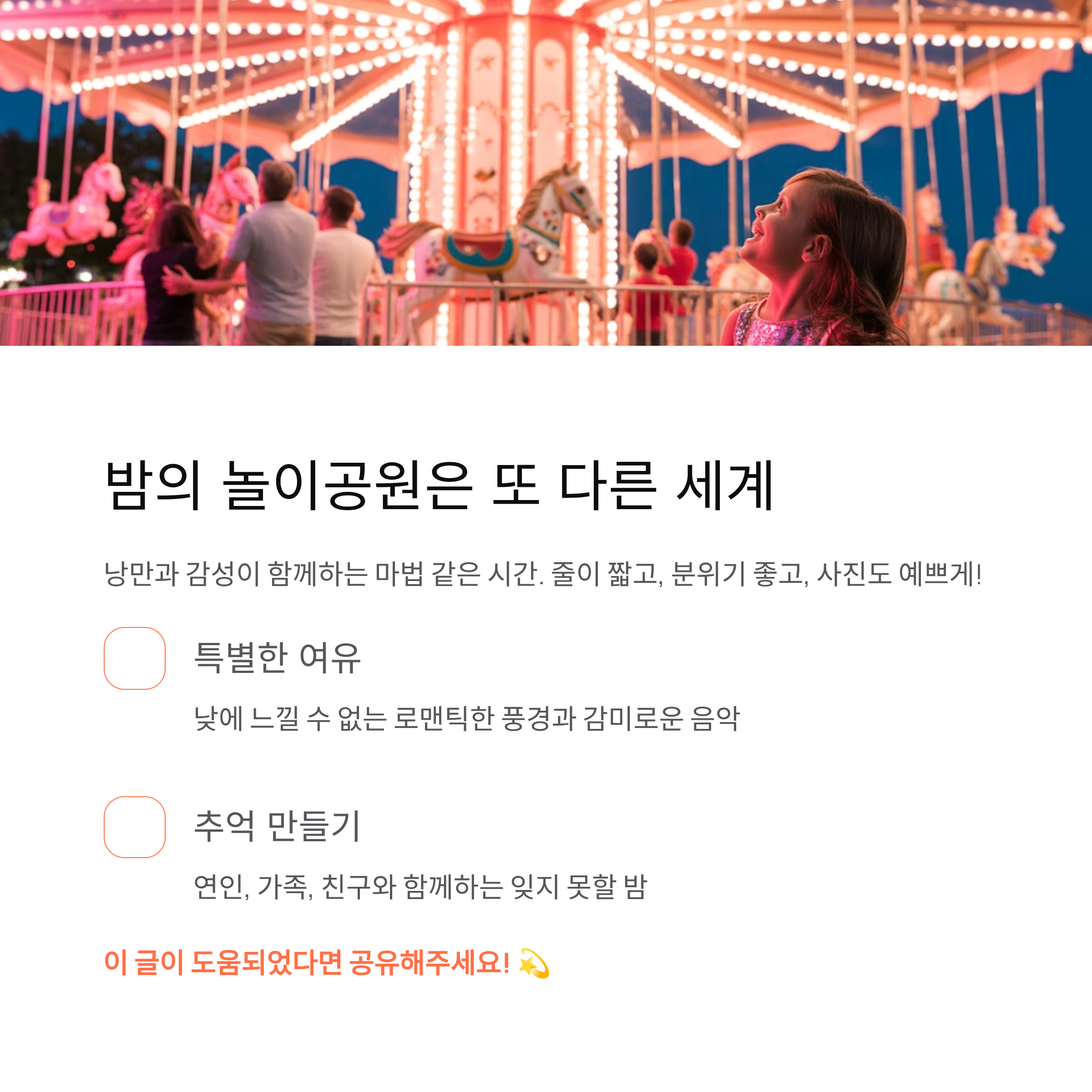오늘은 놀이공원 야간 개장의 매력과, 밤에 방문하면 좋은 이유, 그리고 알차게 즐길 수 있는 꿀팁까지 정리해드릴게요.