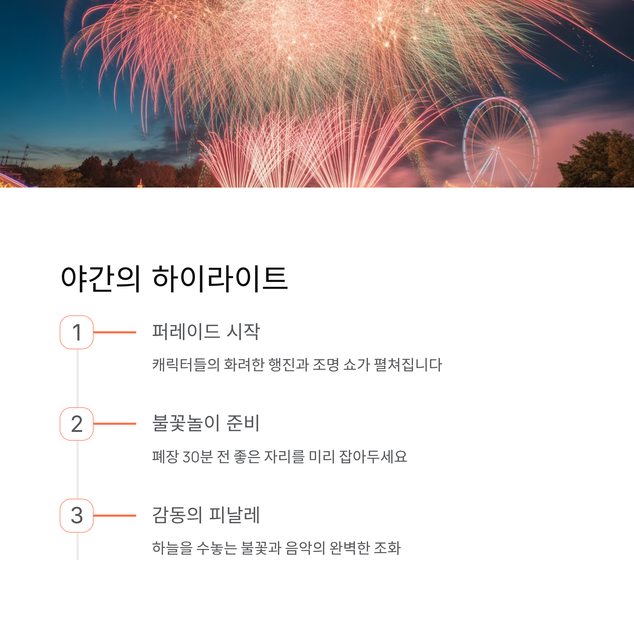 가족 단위라면 퍼레이드와 불꽃놀이 중심으로, 연인이라면 야경과 감성 데이트 코스로, 친구들과는 스릴 넘치는 어트랙션 중심으로 즐기면 좋습니다.