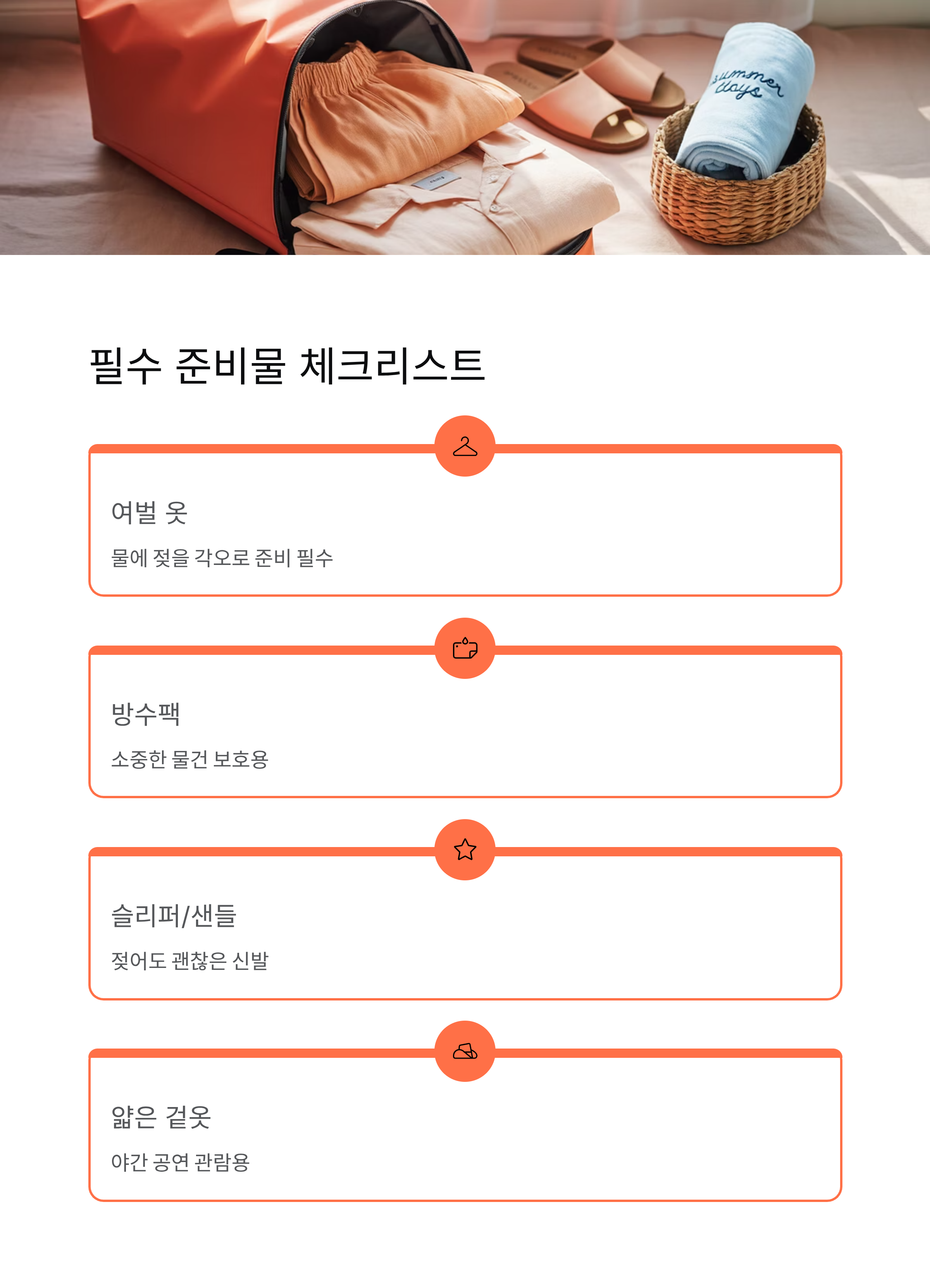 여벌 옷, 방수팩, 슬리퍼나 샌들은 필수이고, 야간 공연까지 즐기려면 얇은 겉옷도 챙기는 게 좋아요.