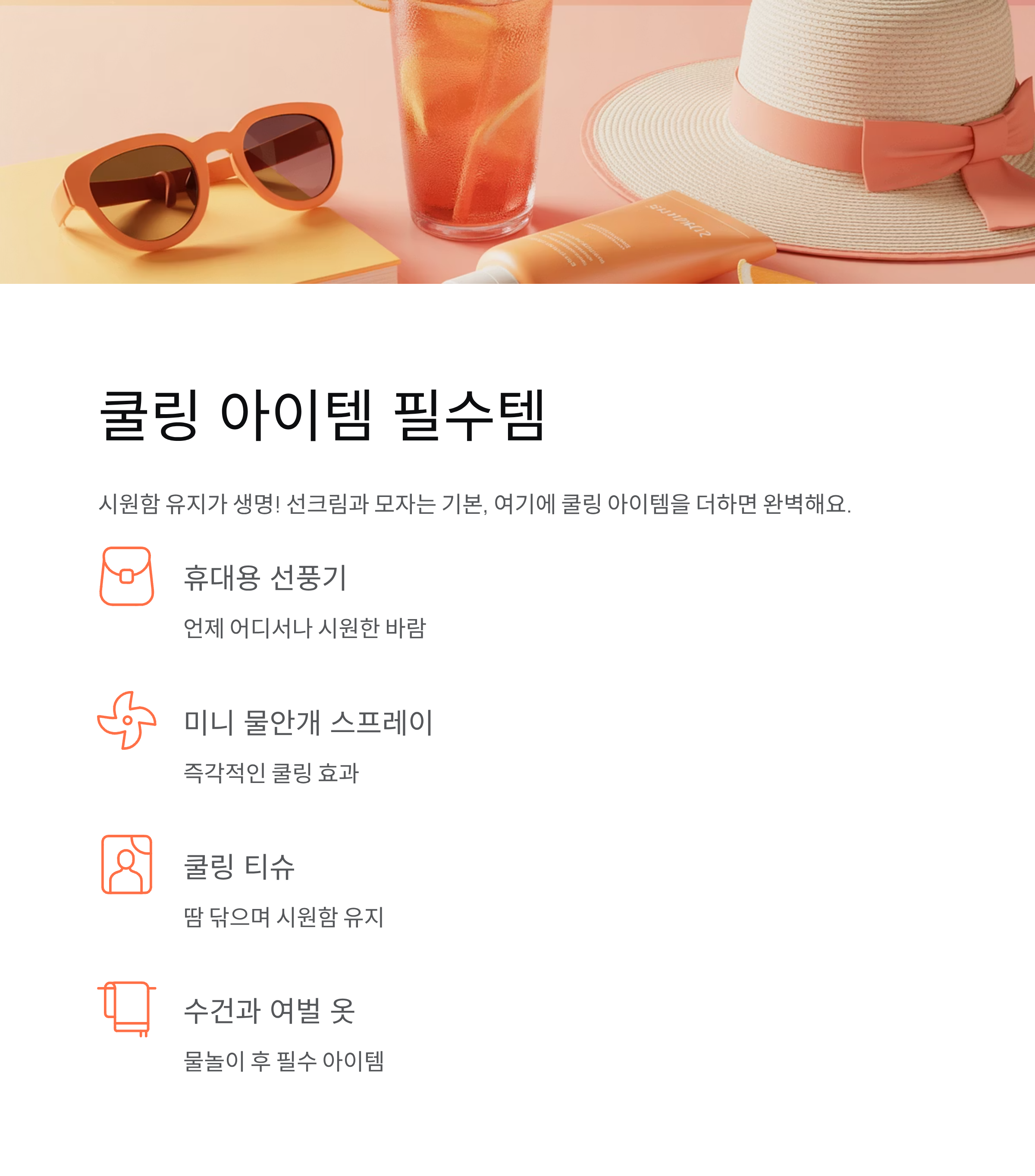 선크림과 모자는 기본이고, 여기에 ‘쿨링 아이템’을 챙기면 훨씬 쾌적해요.