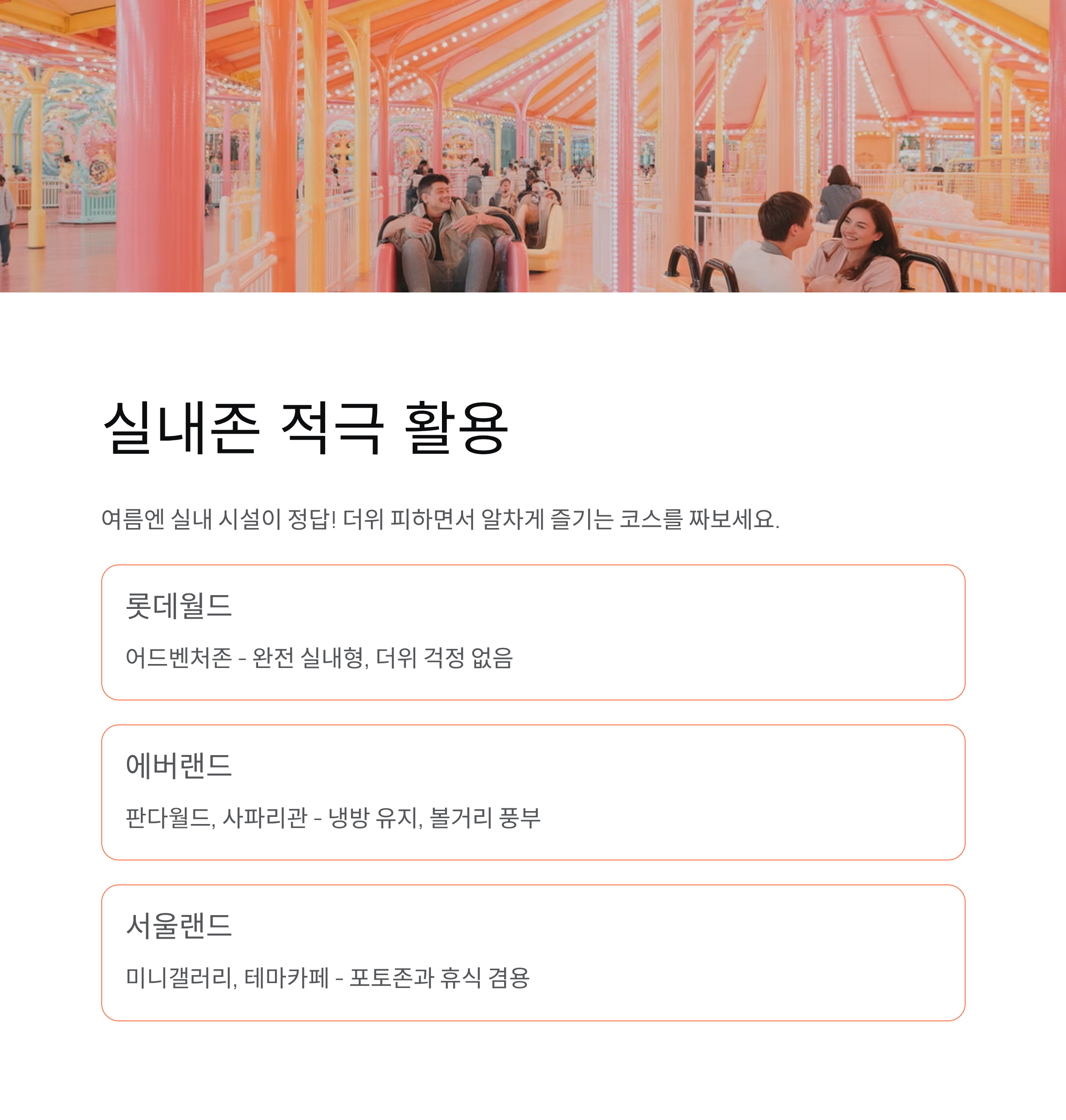 롯데월드처럼 실내 테마파크가 있는 곳은 비나 더위 상관없이 즐기기 좋고,