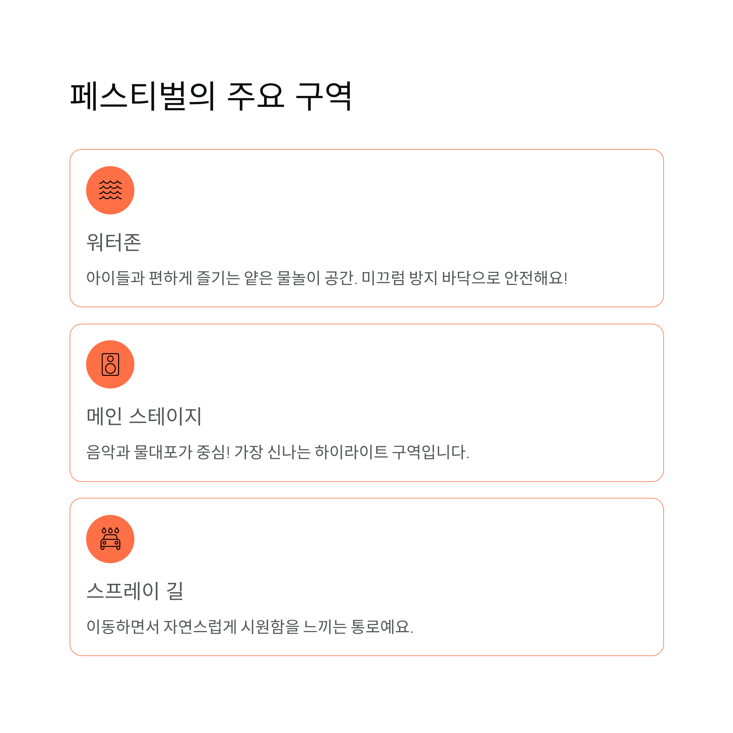 구역별 특징을 정리해본 워터 페스티벌 구성표