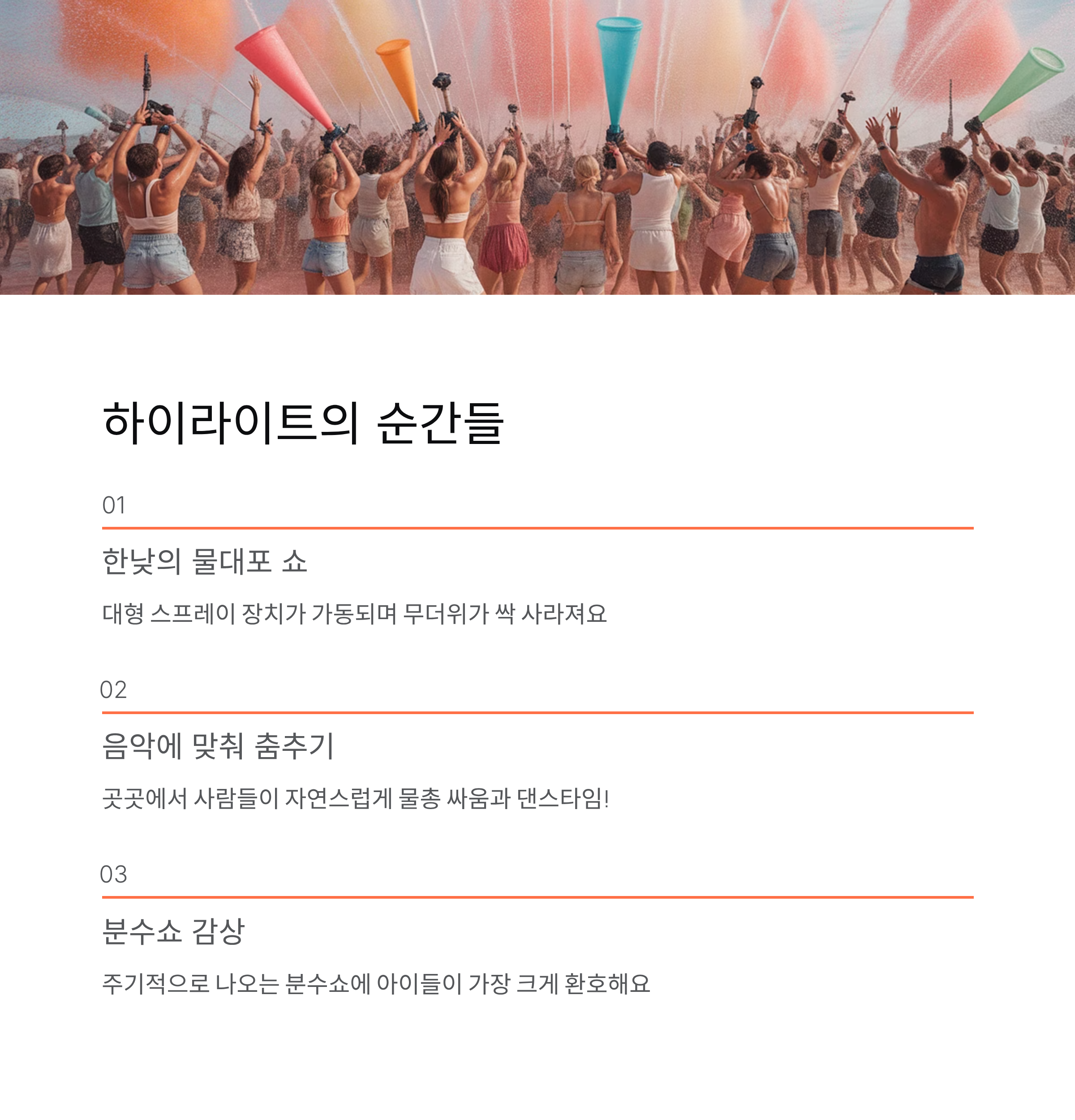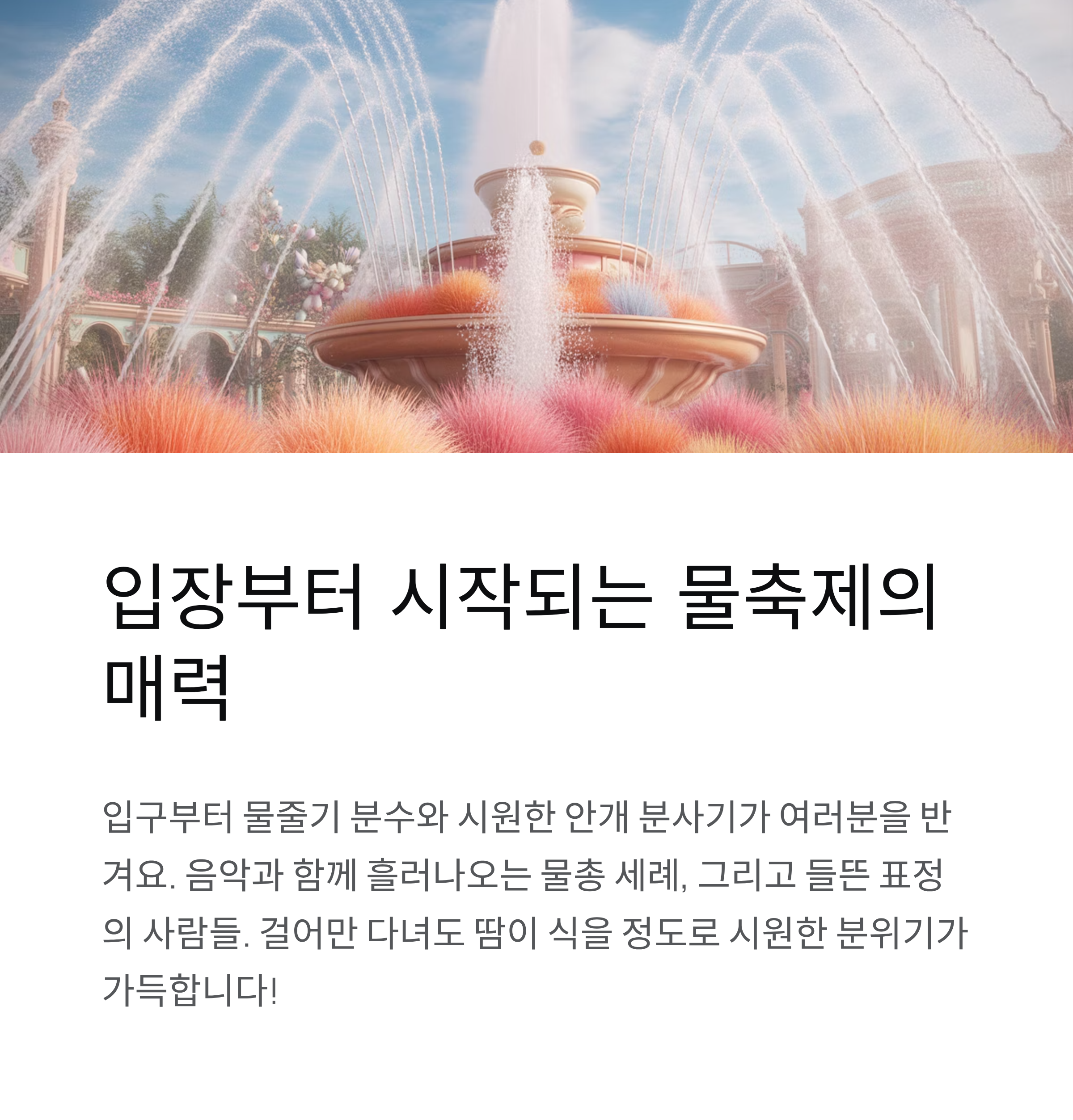 하루 종일 흠뻑 젖으며 즐기는 놀이공원 여름 워터 페스티벌은 그 자체로 좋은 추억이 돼요. 아이와 함께 떠나도 좋고 어른끼리 가도 충분히 신나는 여름 놀거리죠. 시원함과 즐거움, 그리고 활기찬 분위기까지 모두 담겨 있어 올여름 최고의 하루로 기억될 만한 체험이었습니다.