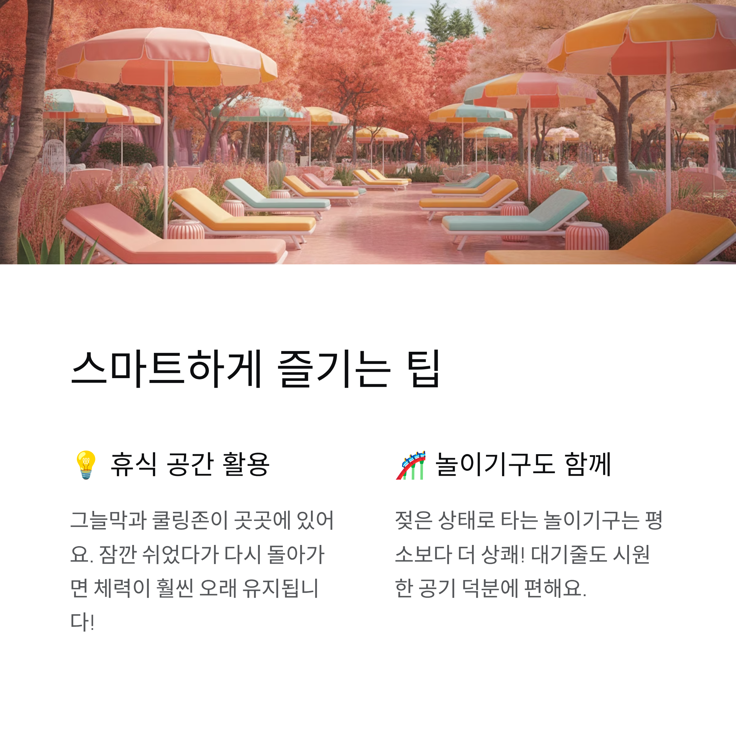 햇볕이 강해지면 잠시 쉴 구역이 꼭 필요하죠. 놀이공원 곳곳에 그늘막과 쿨링존이 마련되어 있었고 물을 마실 수 있는 스테이션도 쉽게 찾을 수 있었어요. 여기서 잠깐 쉬었다가 다시 물축제로 돌아가면 체력이 훨씬 오래 유지되었어요.