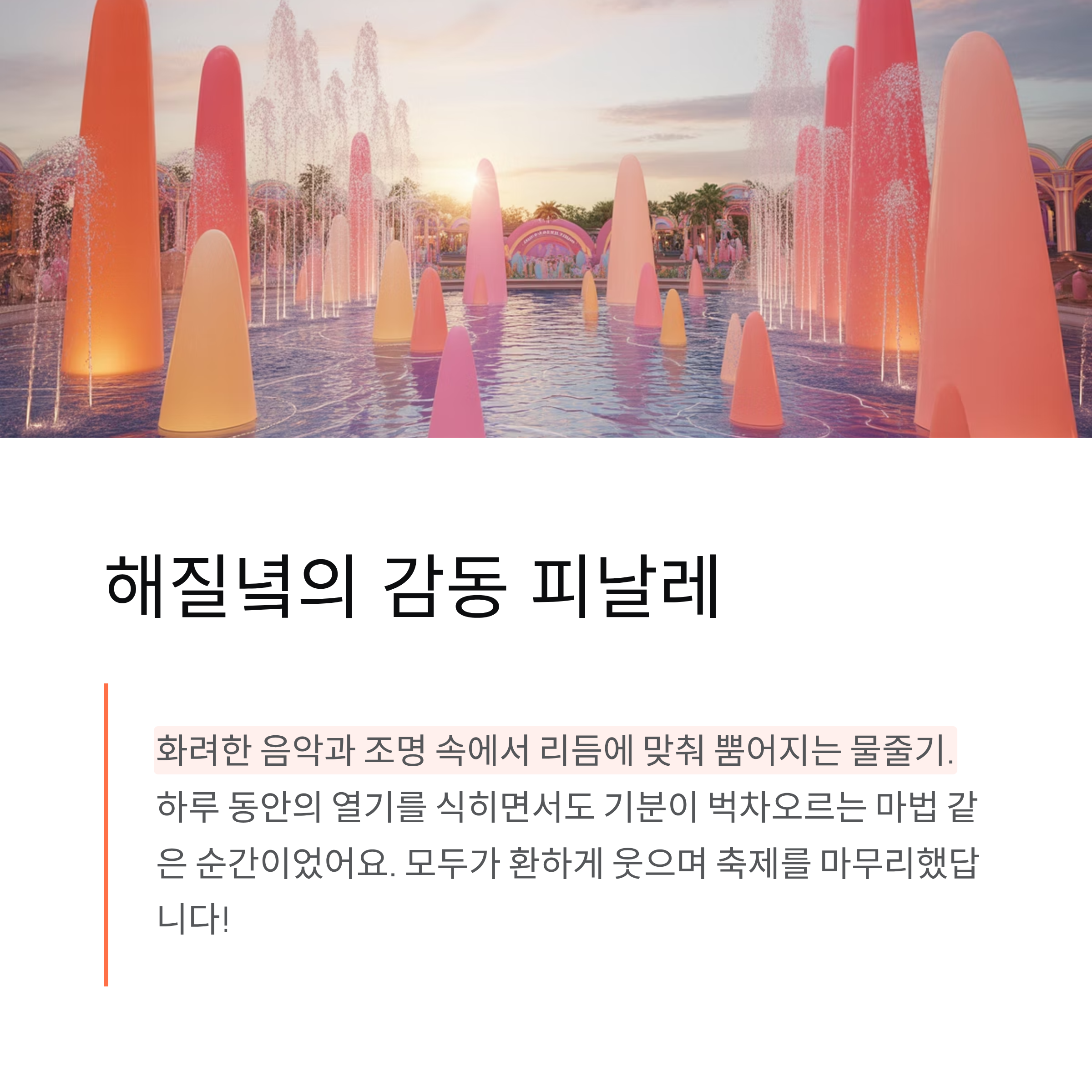 해가 기울기 시작하면 마지막 피날레 시간이 찾아와요. 화려한 음악과 조명 속에서 물줄기가 리듬에 맞춰 뿜어져 나오는데, 하루 동안의 열기를 식히면서도 기분이 벅차오르는 순간이었어요. 아이들도 어른들도 모두 환하게 웃으며 축제를 마무리했습니다.