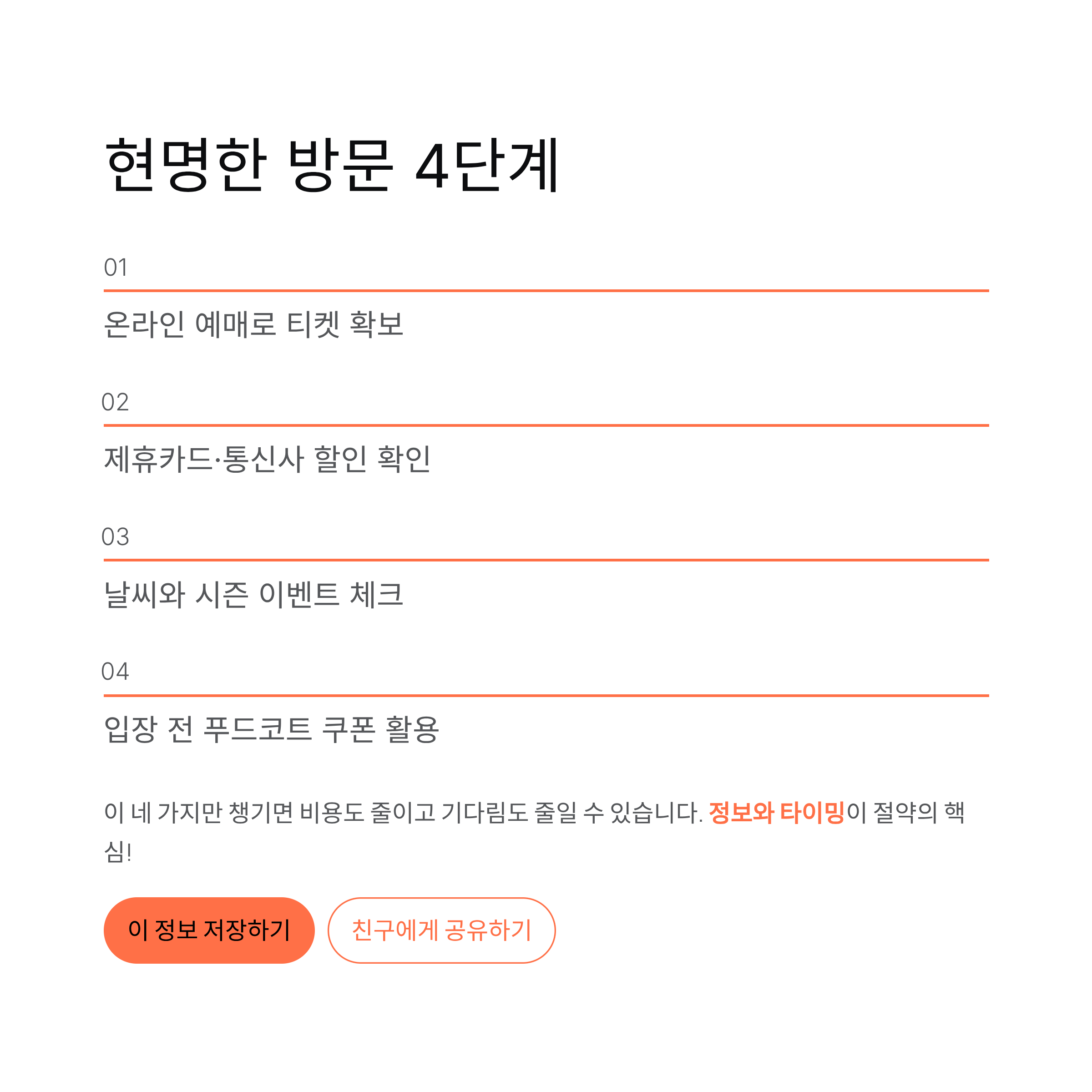 제휴카드·멤버십·온라인 예매만 잘 활용해도 반값으로 즐길 수 있고, 시즌 이벤트를 맞춰가면 더욱 풍성한 하루가 됩니다.