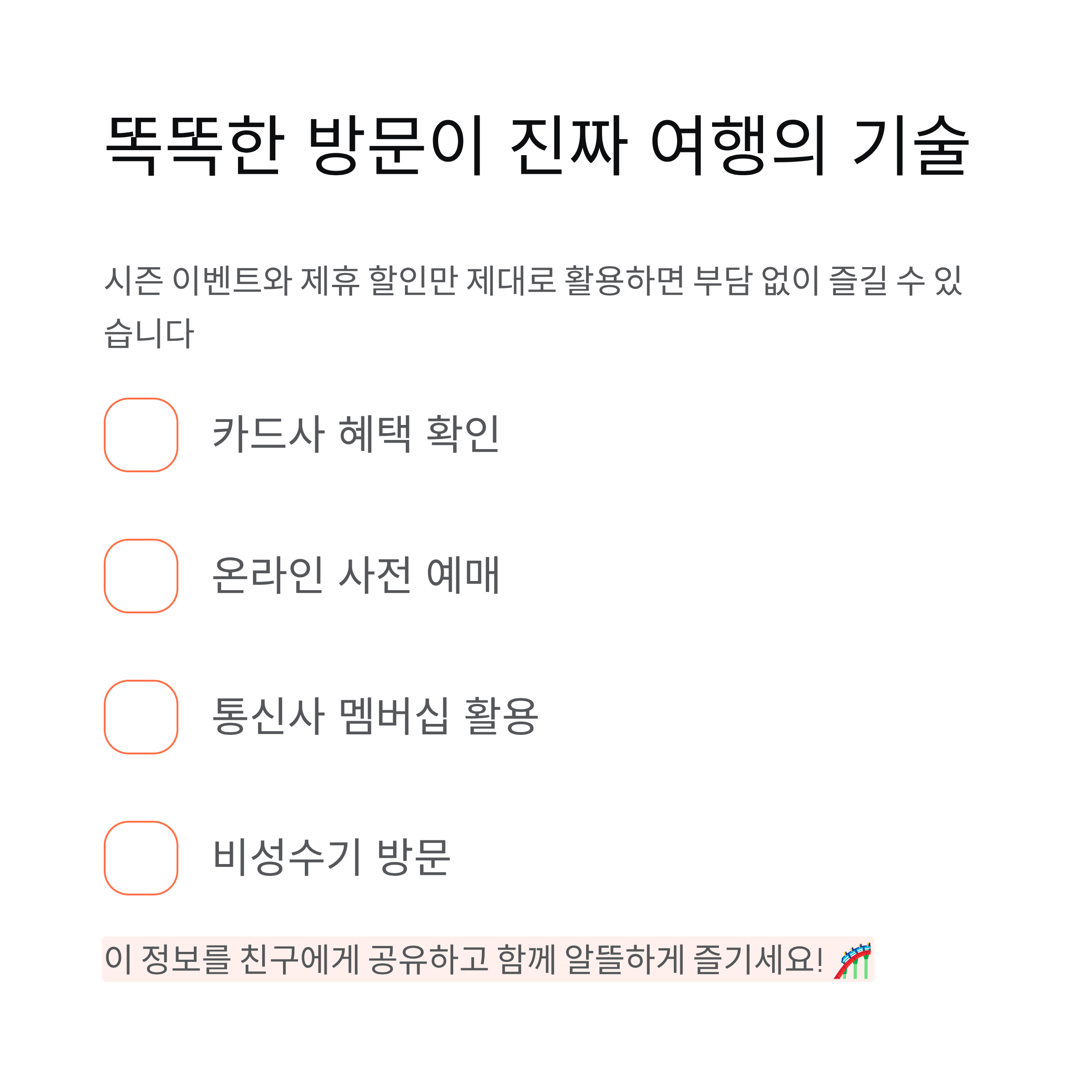 카드사 혜택, 온라인 예매, 통신사 멤버십, 그리고 비성수기 방문까지 — 이 네 가지만 기억해도 절반 가격으로 같은 하루를 보낼 수 있어요.