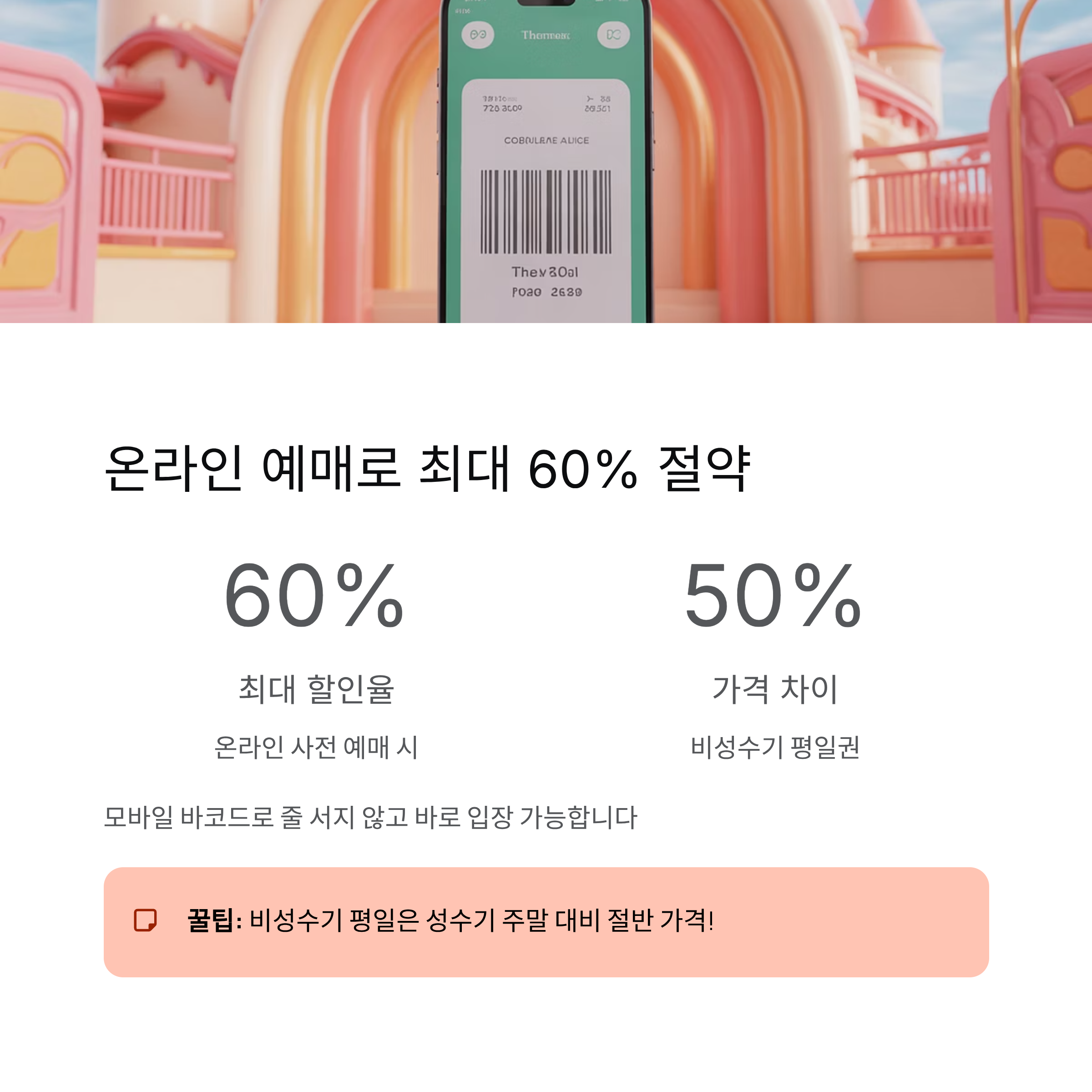 놀이공원 공식 홈페이지나 제휴 여행 플랫폼을 통해 예매하면 평균 30~60%까지 할인 받을 수 있습니다.