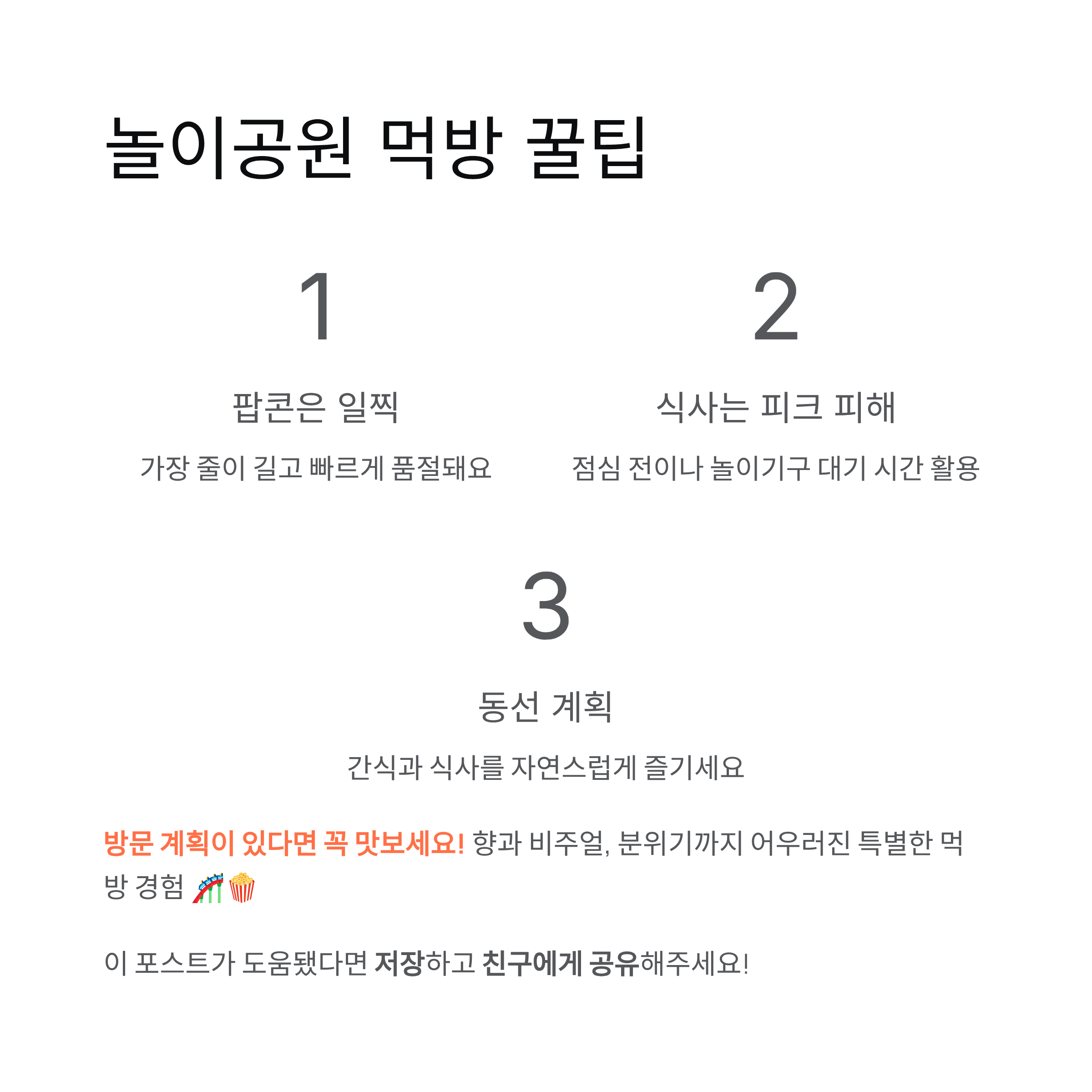 놀이공원 인기 메뉴들은 단순한 간식을 넘어 하루의 즐거움을 더해주는 요소였어요. 걸으면서 가볍게 먹기 좋은 메뉴부터 든든하게 즐기는 식사 메뉴, 시즌 한정 디저트까지 다양해 선택하는 재미가 컸습니다. 향과 비주얼, 분위기까지 함께 어우러져 놀이공원만의 특별한 먹방 경험을 만들어줘요. 방문 계획이 있다면 본인의 동선에 맞춰 한두 가지는 꼭 맛보는 걸 추천할 만큼 만족감이 높은 메뉴들이었어요.