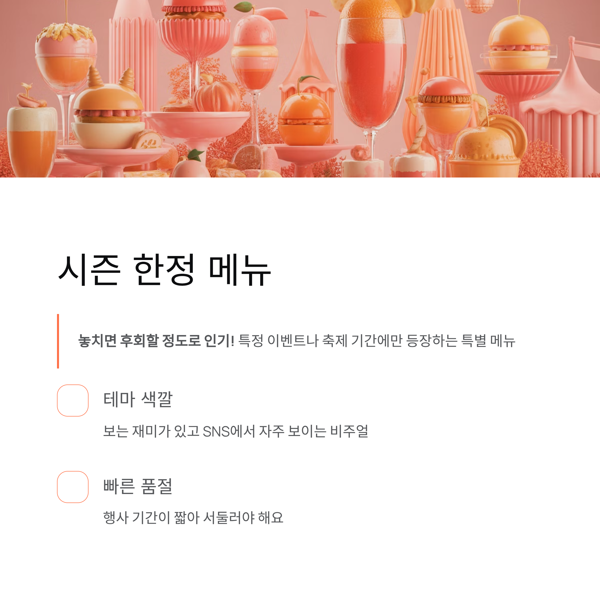 특정 이벤트나 축제 기간에는 한정 메뉴가 등장해 인기가 높아요. 테마 색깔이 들어가 있어 보는 재미가 있고, 사진이 예쁘게 나와 SNS에서도 자주 보이는 편이에요. 행사 기간이 짧아 빨리 구매하지 않으면 금방 품절되기도 했습니다.