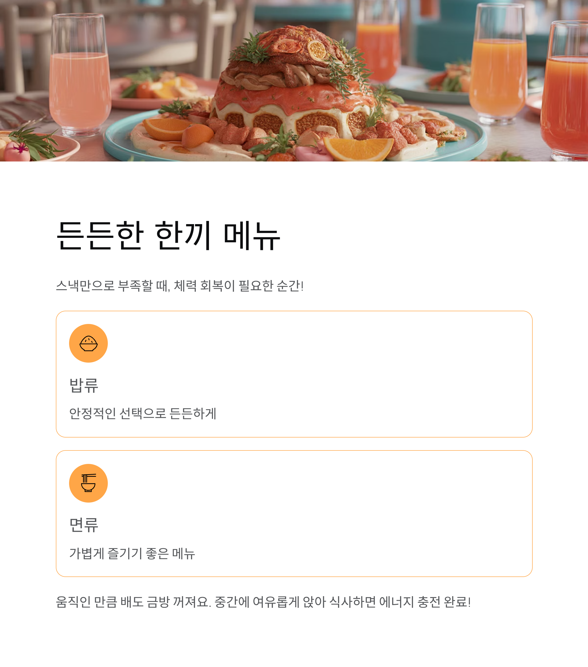 놀이공원에서는 스낵만 먹기 부족한 분들을 위해 든든한 식사 메뉴도 많이 준비돼 있어요. 움직인 만큼 배도 금방 꺼지는 편이라 중간쯤 여유롭게 앉아 식사를 즐기면 체력 회복에 도움이 됐어요. 아래는 방문 시 자주 보였던 구성 예시예요.