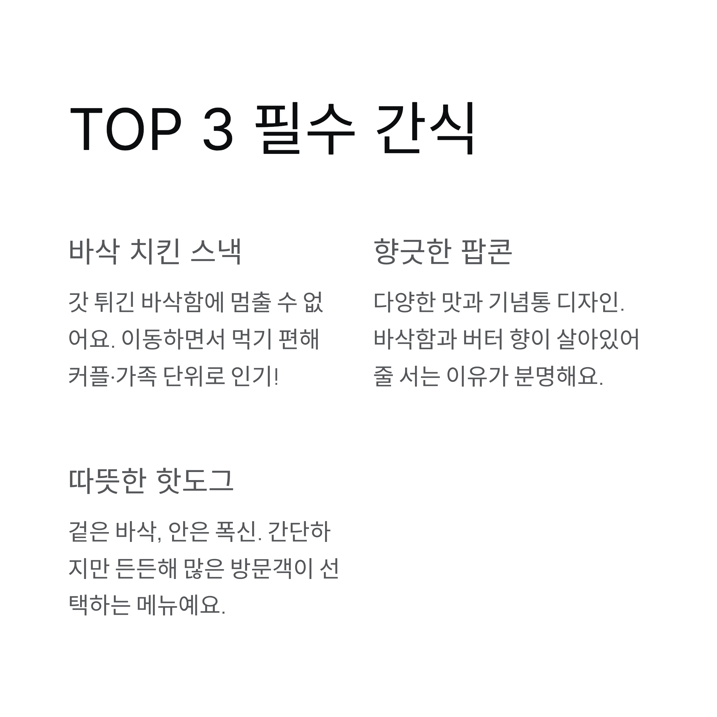 핫도그는 간단하지만 은근히 든든한 메뉴라 많은 방문객들이 선택하고 있었어요. 겉은 바삭하고 안은 폭신해 먹는 순간 만족감이 컸어요. 아래는 현장에서 느낀 구성 예시를 표로 정리한 흐름이에요.
