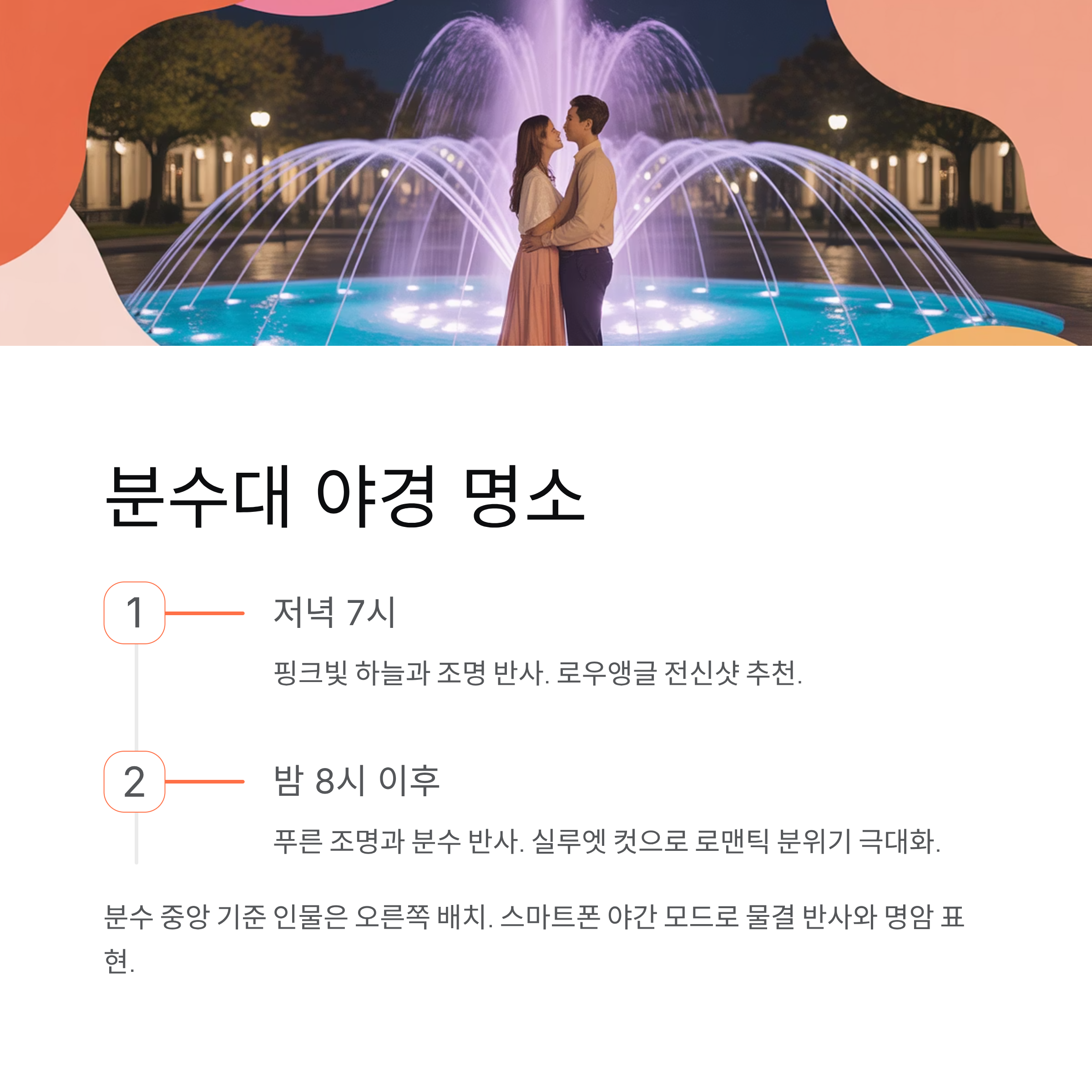 | 밤 8시 이후 | 푸른 조명과 분수 반사 | 실루엣 컷 |