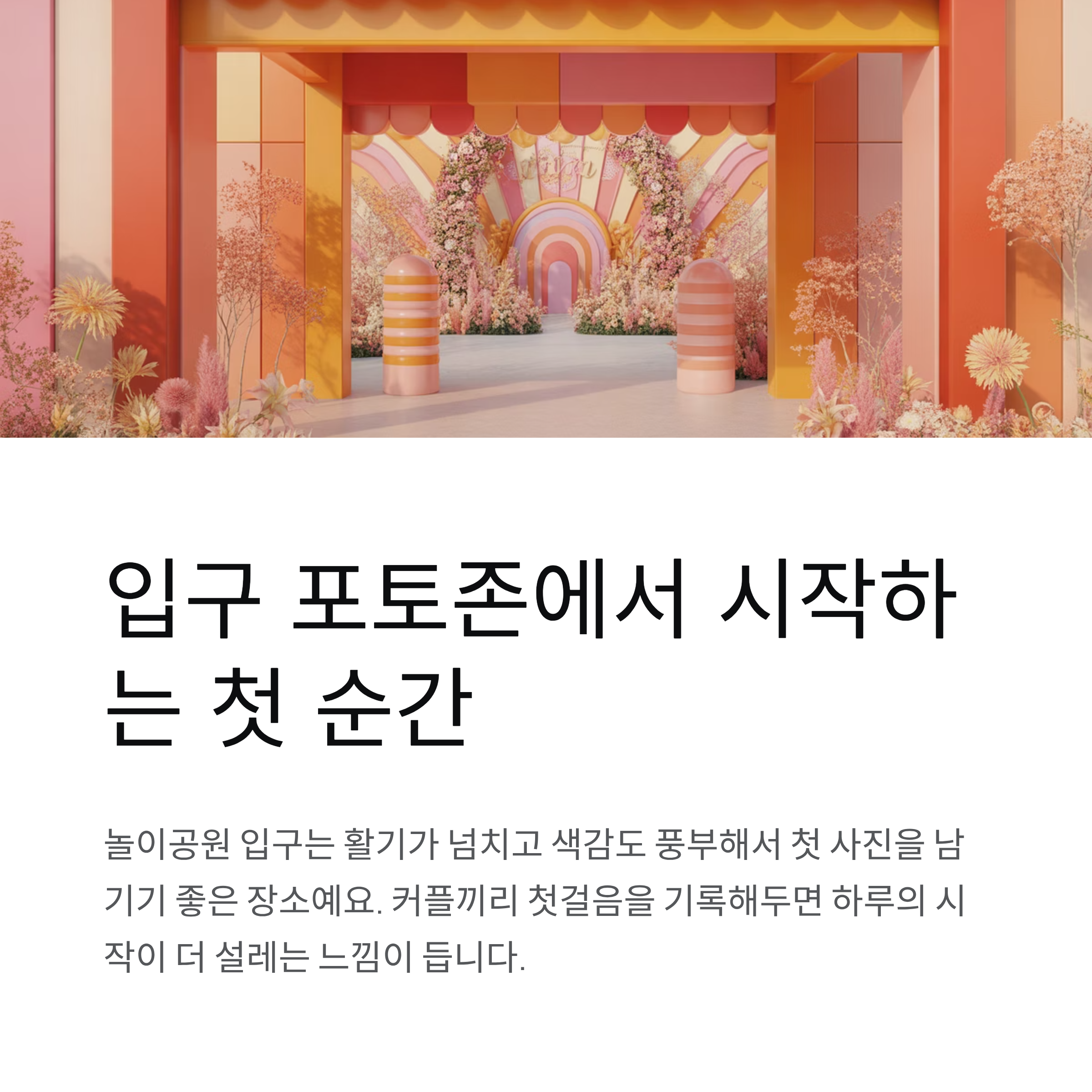 놀이공원은 공간 자체가 즐거움으로 구성되어 있어 어떤 순서로 걸어도 재미있지만, 커플이라면 분위기 좋은 순간을 자연스럽게 이어주는 루트가 훨씬 만족도가 높아요. 입구 포토존에서 시작해 회전목마와 산책로를 지나 저녁 퍼레이드로 마무리하면 하루가 자연스럽고 안정적으로 완성됩니다.