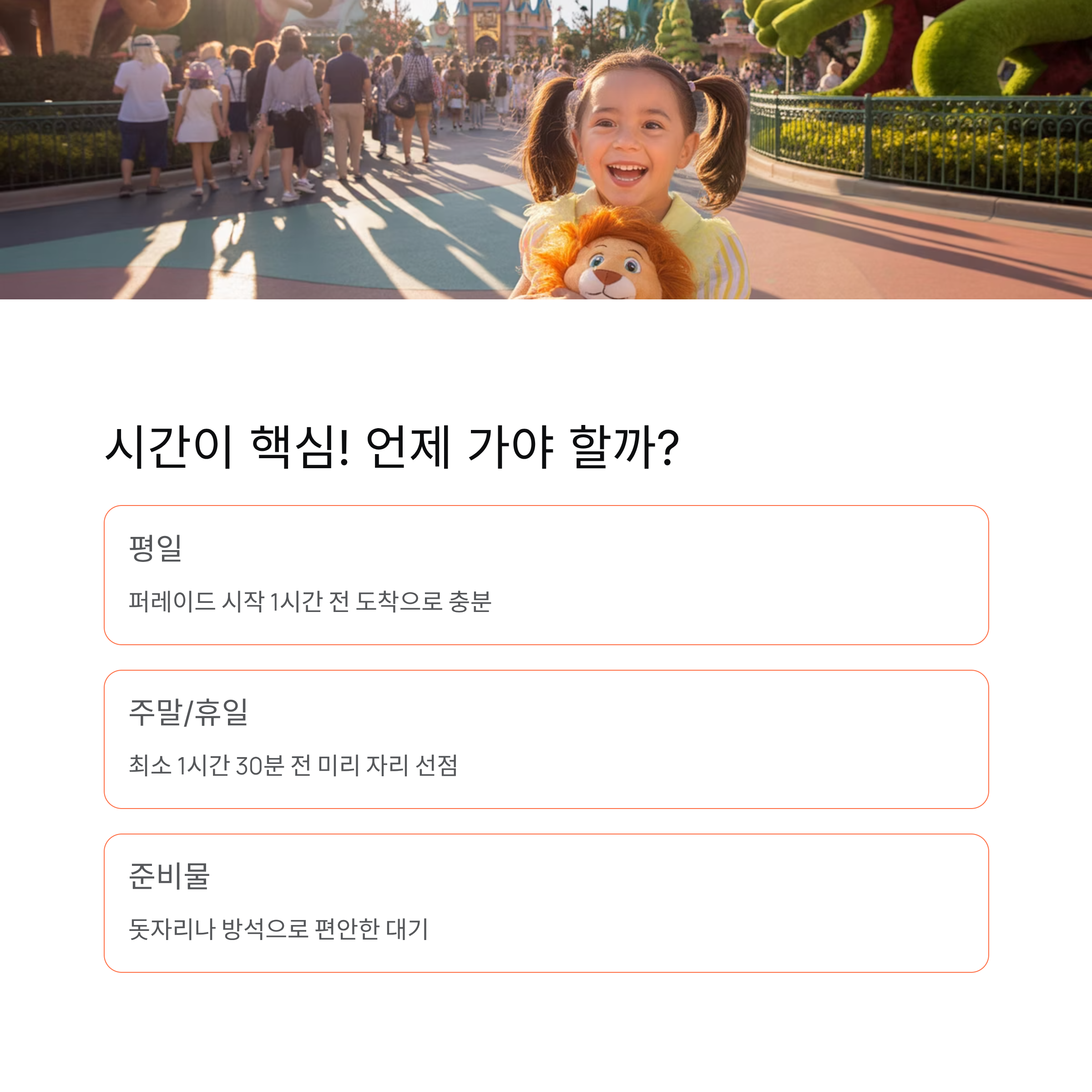 놀이공원 퍼레이드 관람 꿀팁, 앞자리 확보하는 법