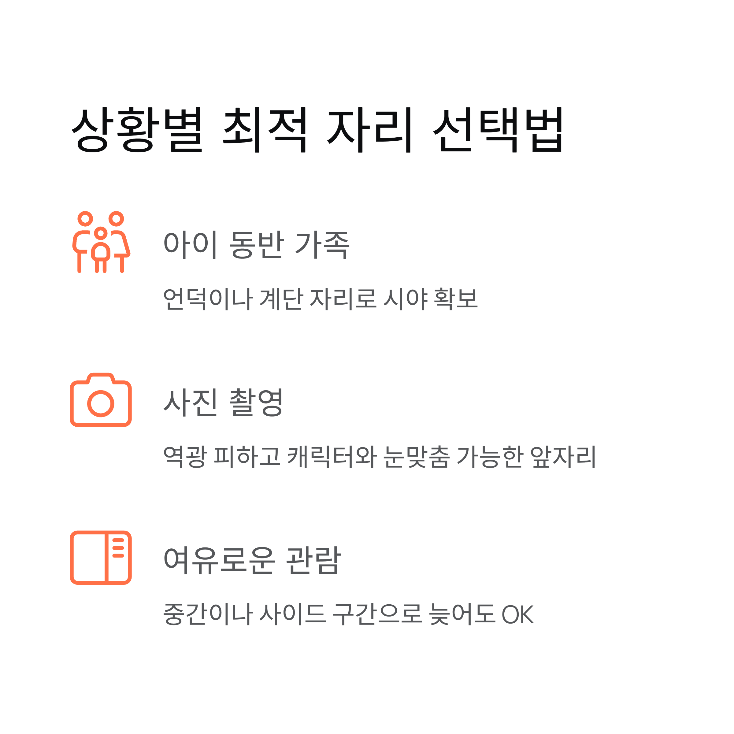 시간을 아끼고, 동선을 확인하며, 상황에 맞는 자리를 고른다면 누구보다 특별한 순간을 만날 수 있을 것입니다.