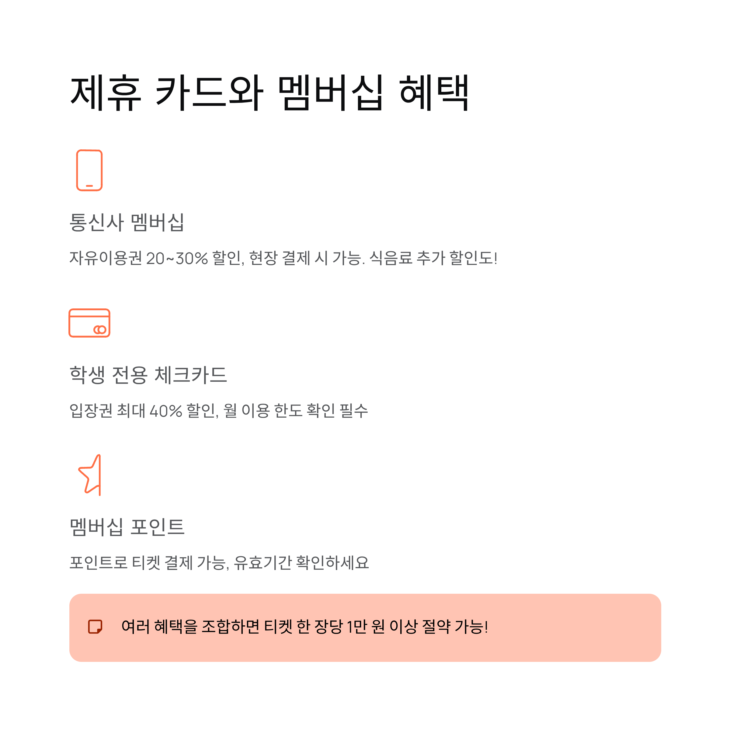| 학생 전용 체크카드 | 입장권 최대 40% 할인 | 월 이용 한도 있음 |
