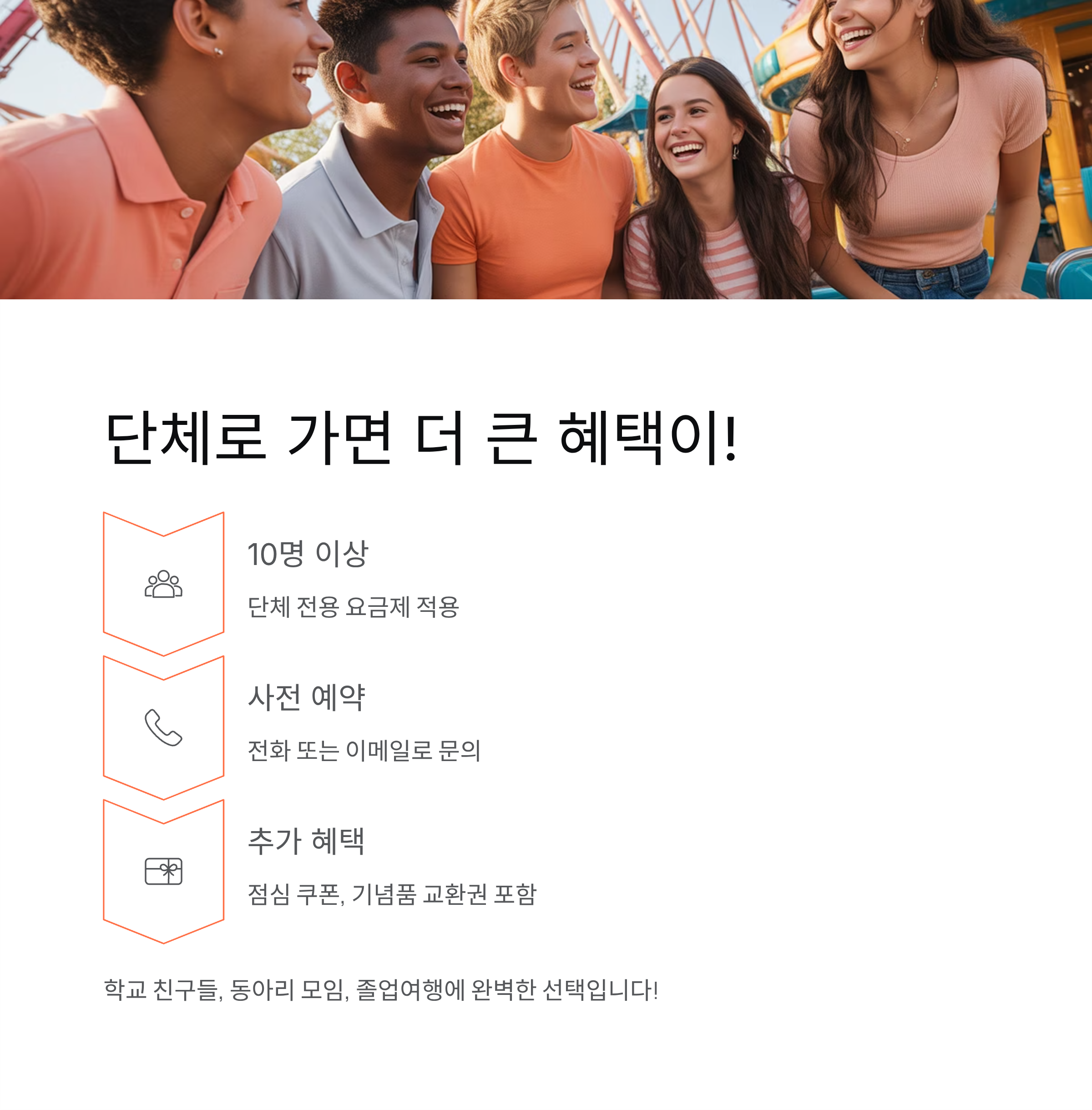 놀이공원에서는 10명 이상 단체 예약 시 ‘단체 전용 요금제’를 운영하는 경우가 많아요.