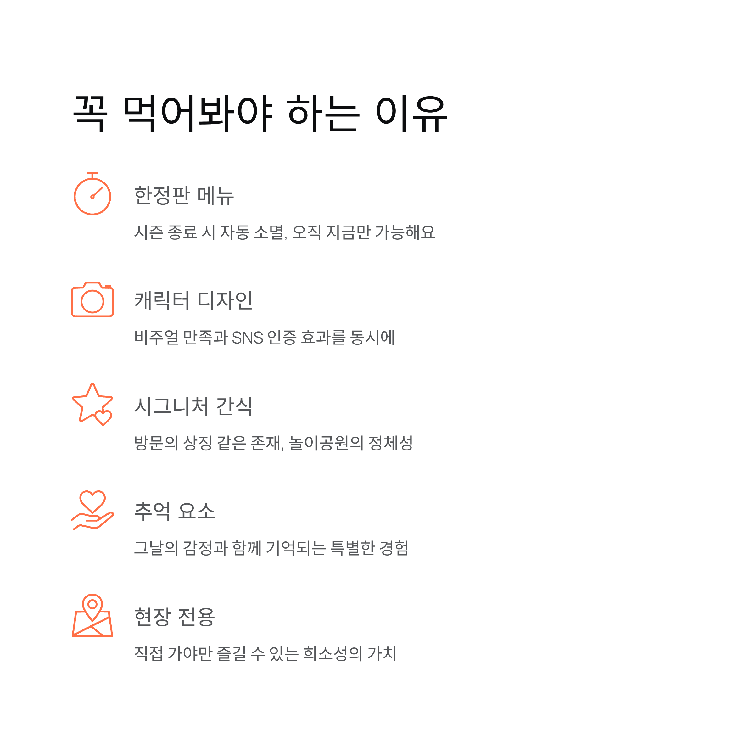 시즌 한정, 테마 한정, 캐릭터 한정 등 오직 그곳에서만 맛볼 수 있는 특별함이 더해져 하나의 ‘체험’으로 자리 잡았어요.