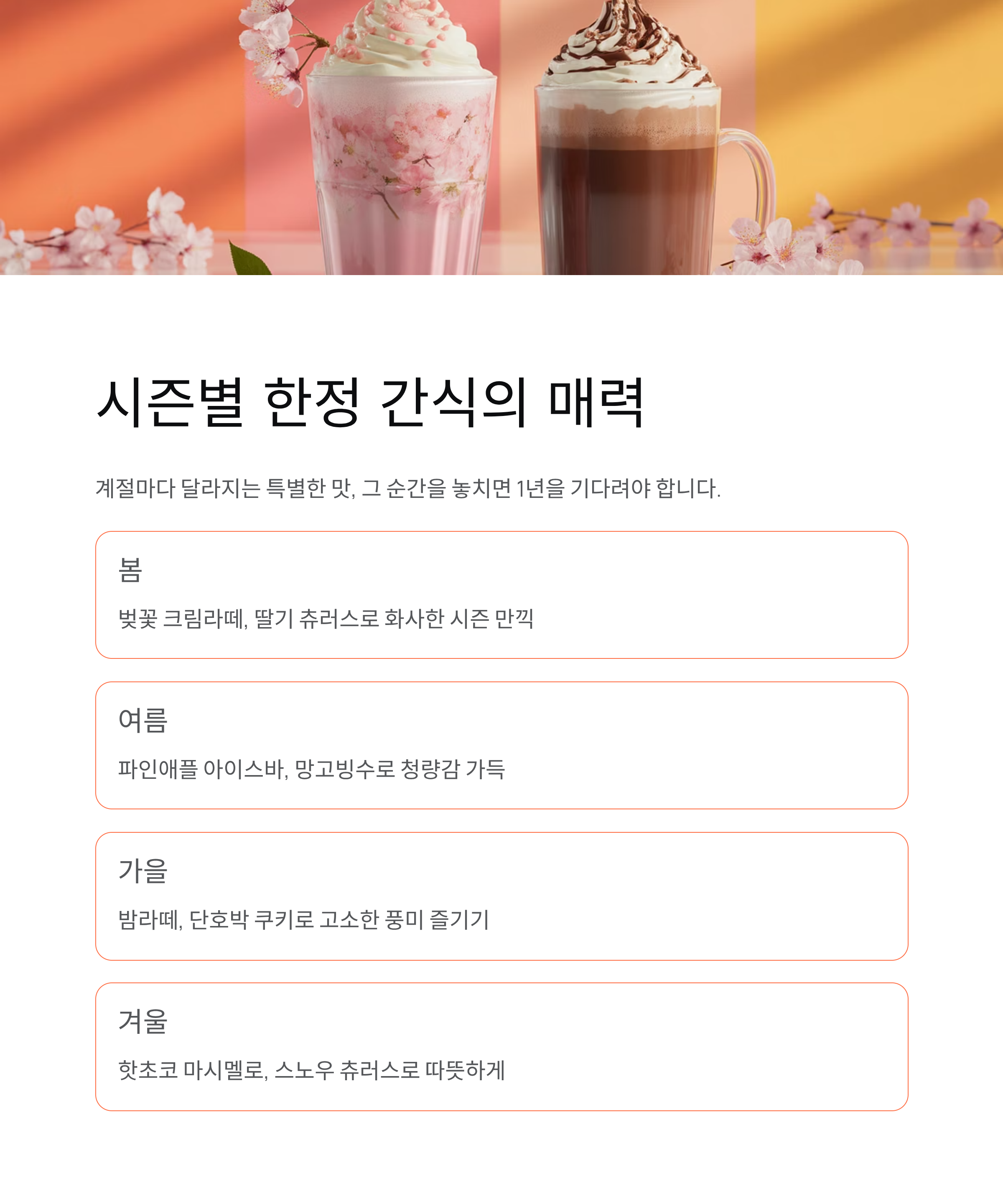 예를 들어 봄에는 벚꽃맛 아이스크림, 여름엔 시원한 망고 빙수, 겨울엔 따뜻한 군고구마 라떼 같은 식이에요.