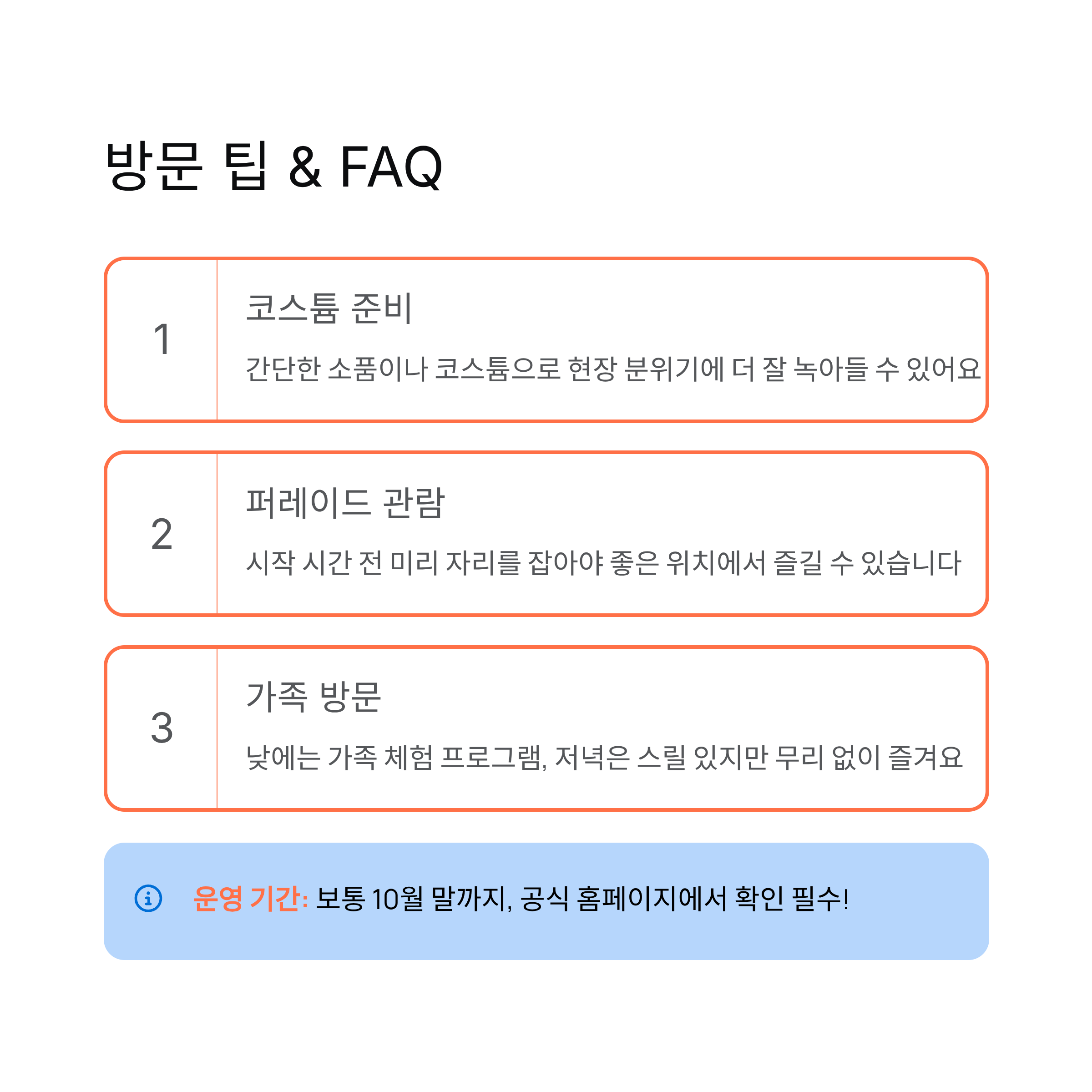 또한 퍼레이드 시작 시간은 사람들이 몰리기 때문에 미리 자리를 잡아야 좋은 위치에서 즐길 수 있습니다.