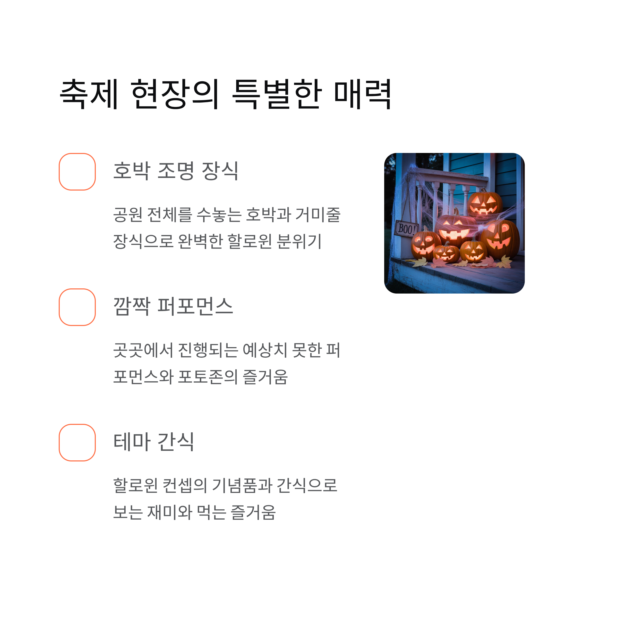 놀이공원 할로윈 축제는 코스튬, 퍼레이드, 다양한 퍼포먼스로 가득한 특별한 경험이었습니다.
