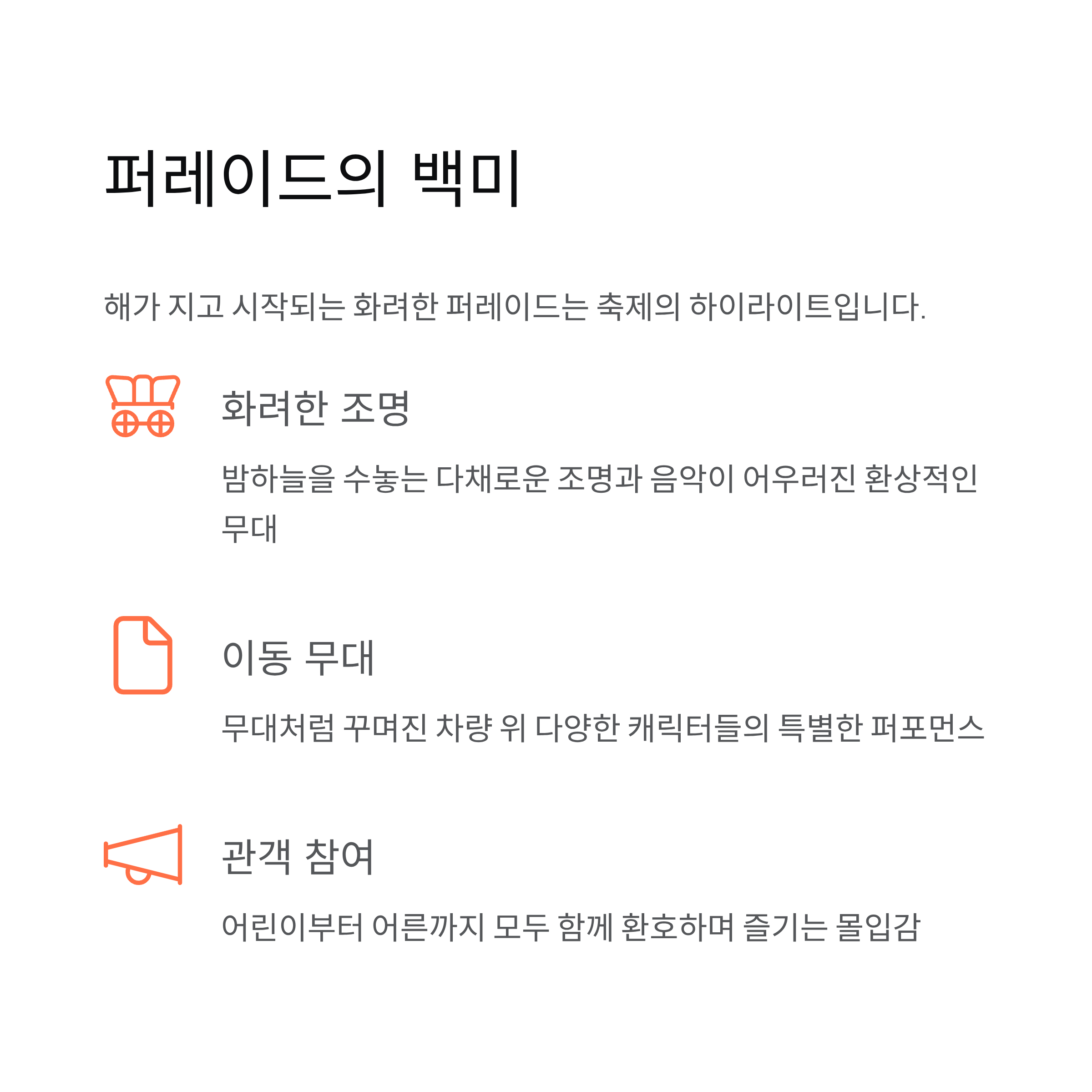 또한 퍼레이드 시작 시간은 사람들이 몰리기 때문에 미리 자리를 잡아야 좋은 위치에서 즐길 수 있습니다.