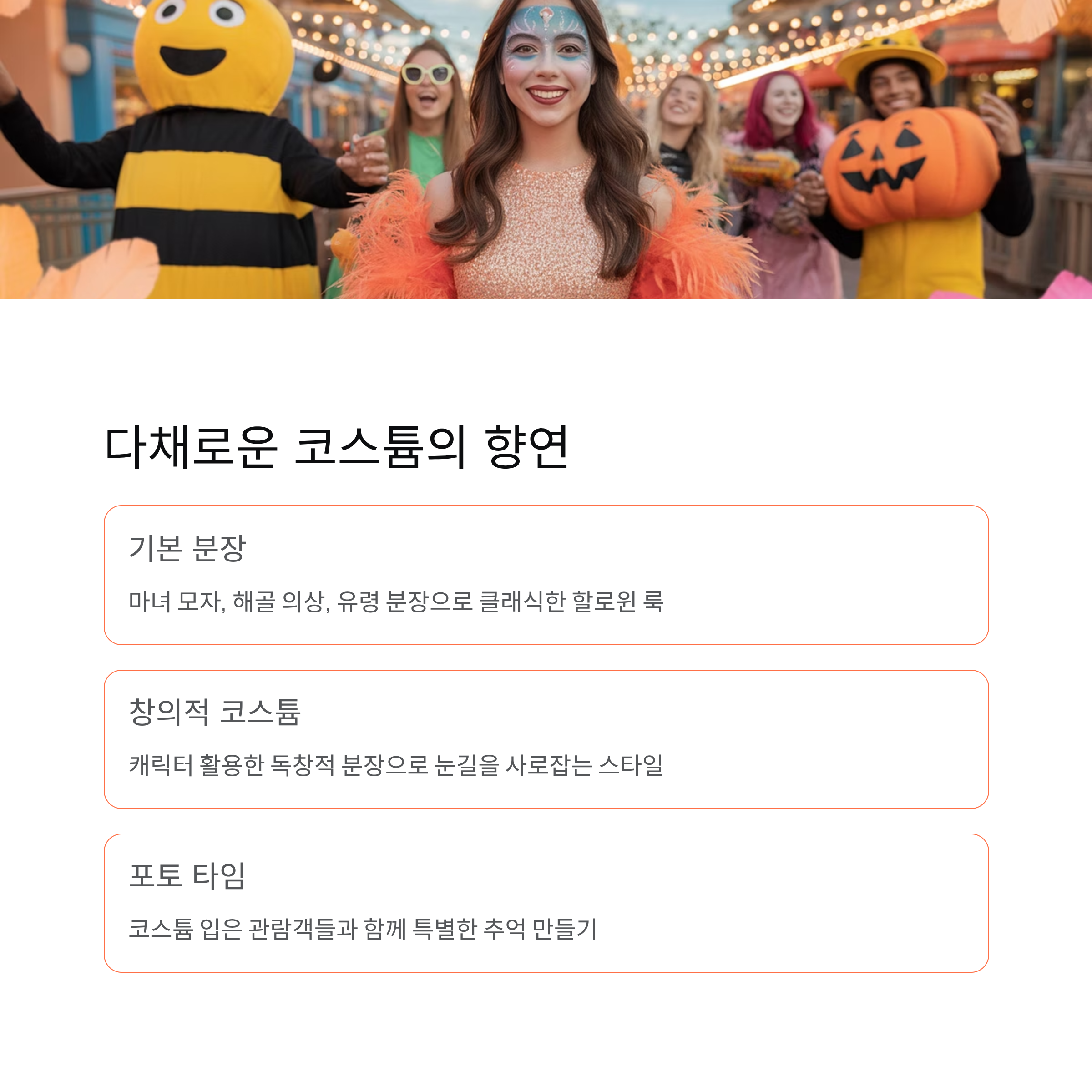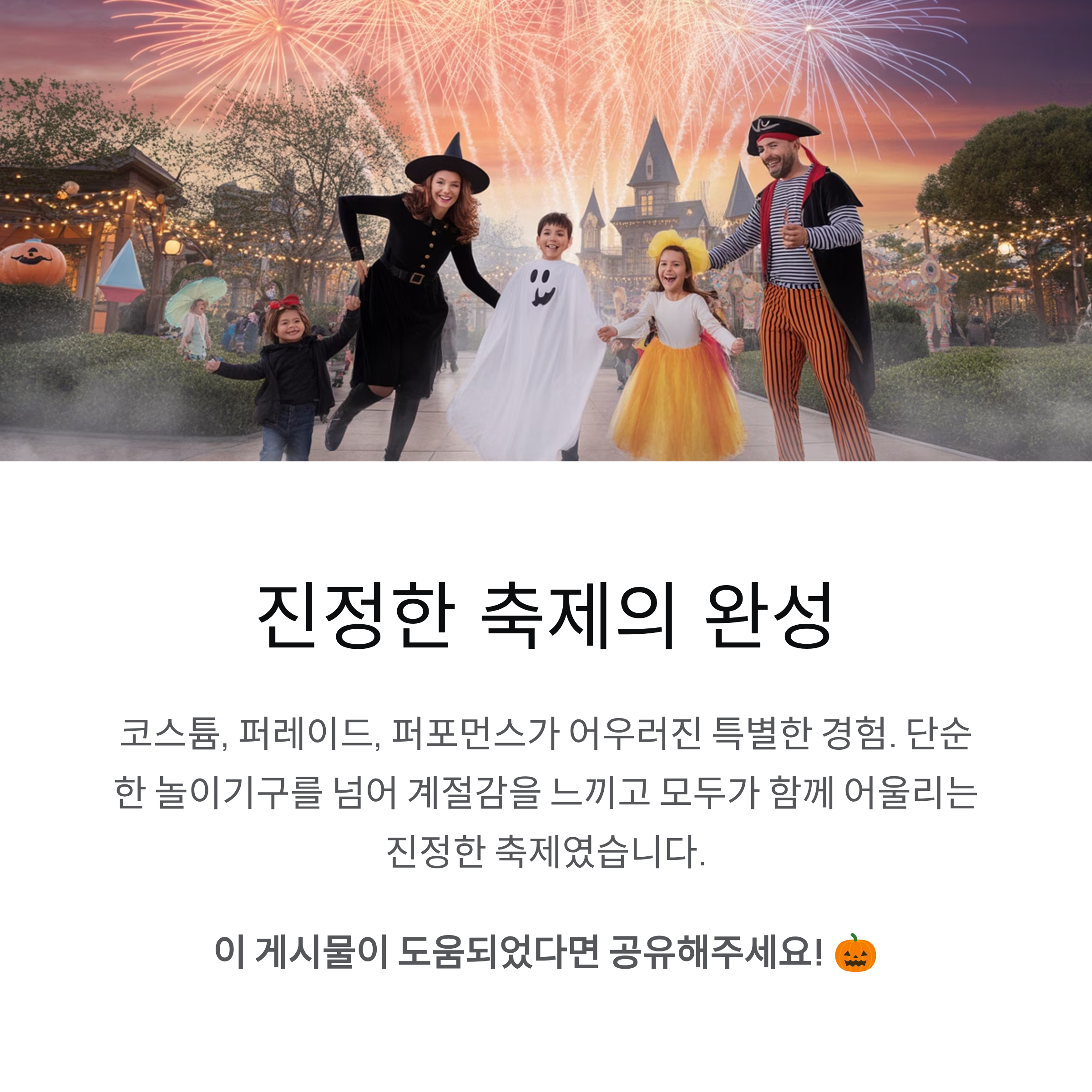 놀이공원 할로윈 축제는 코스튬, 퍼레이드, 다양한 퍼포먼스로 가득한 특별한 경험이었습니다.