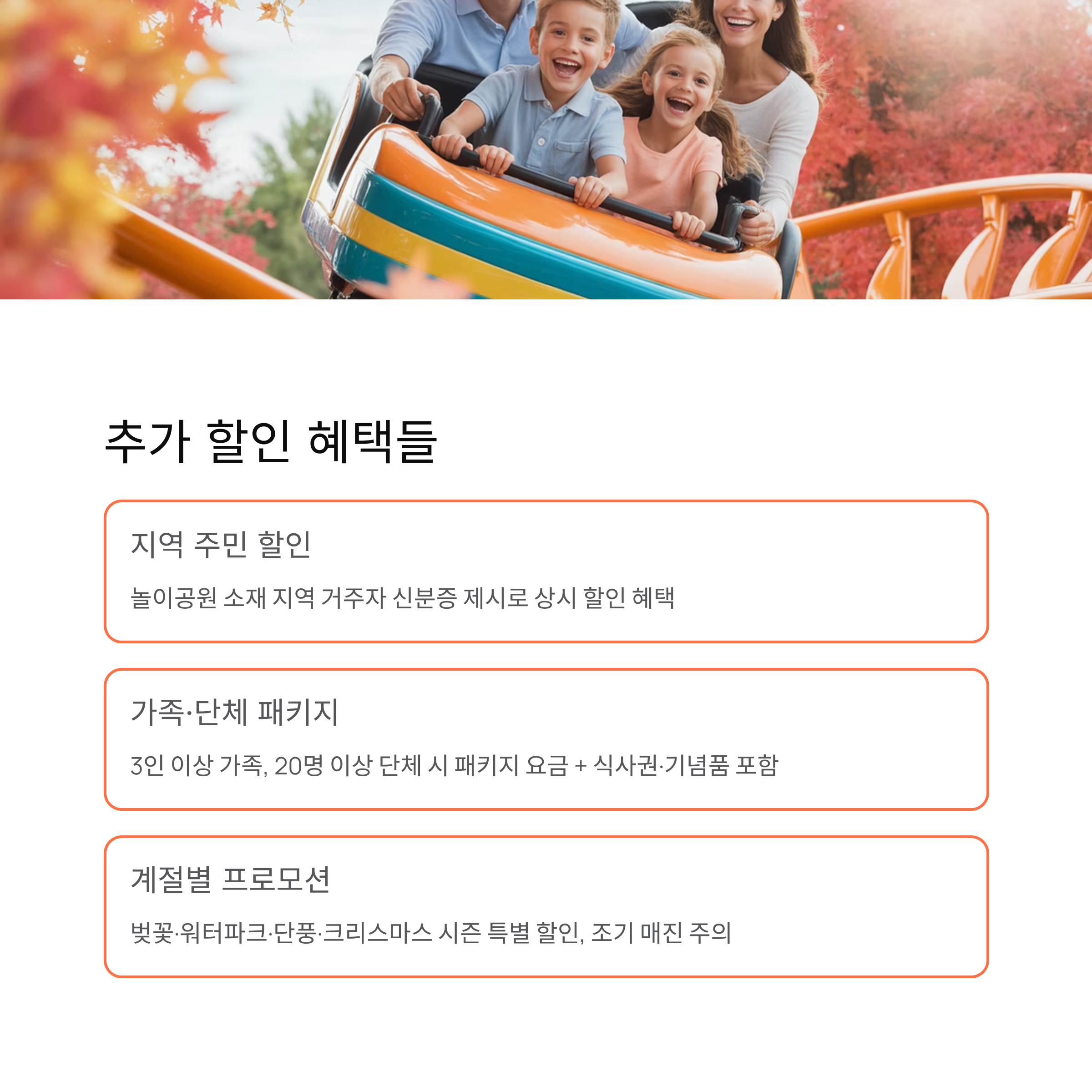 놀이공원이 위치한 지역 주민을 대상으로 상시 할인 혜택을 제공하는 경우도 많습니다.