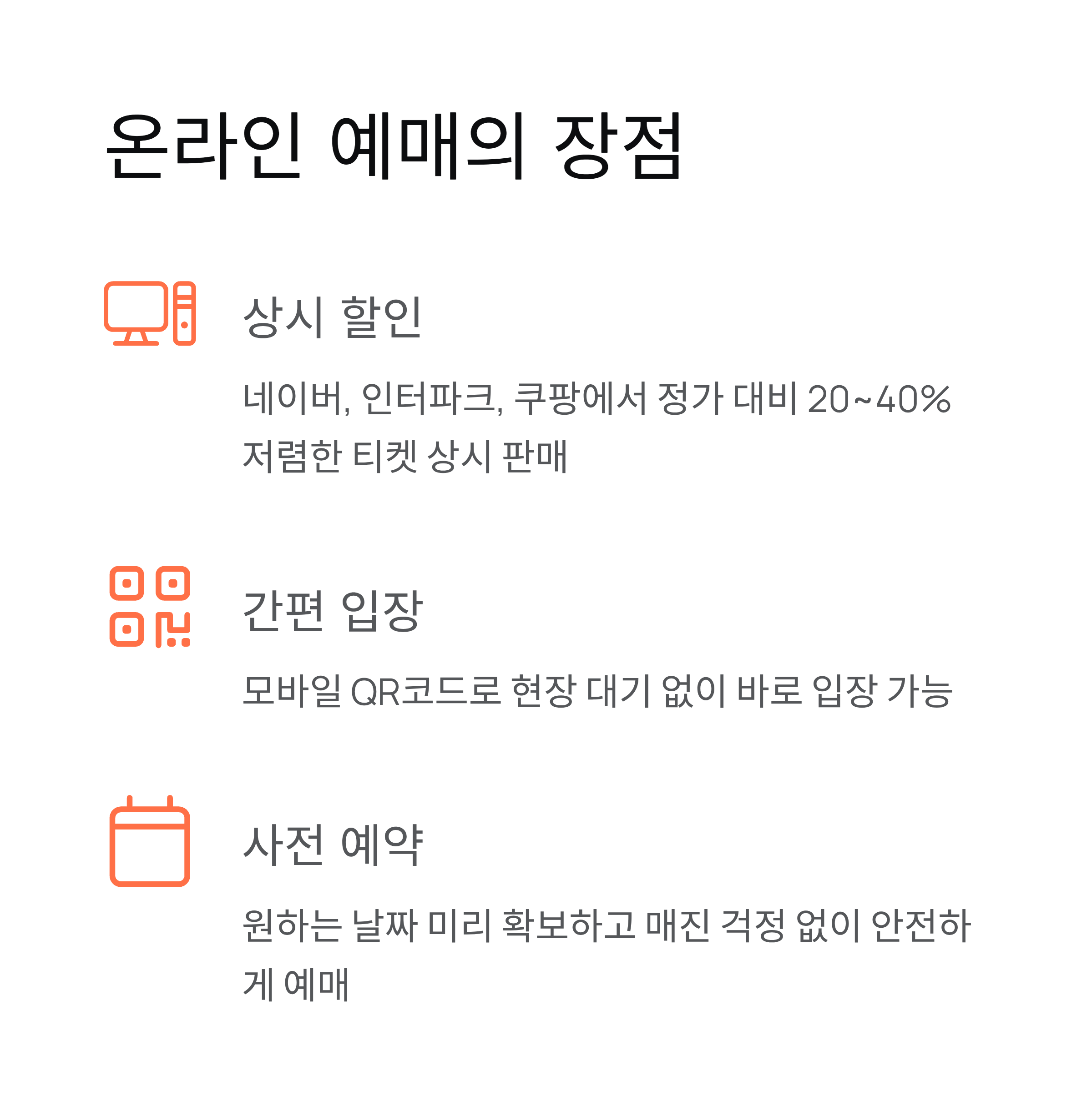 | 온라인 예매 | 20~40% | 상시 할인, QR 입장 |