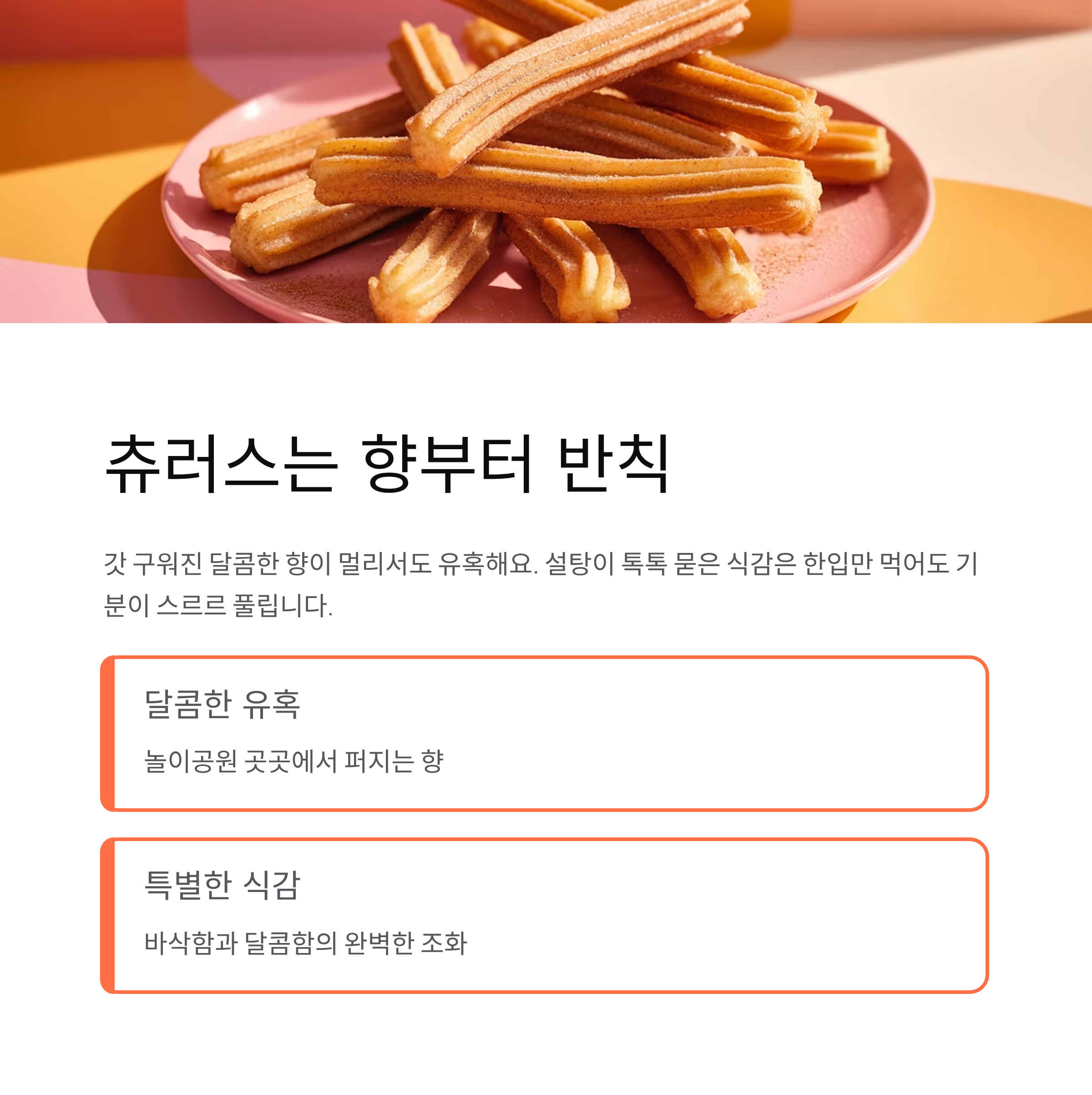 | 츄러스 | 향으로 먼저 유혹 | 바삭함과 달콤함의 조화 |