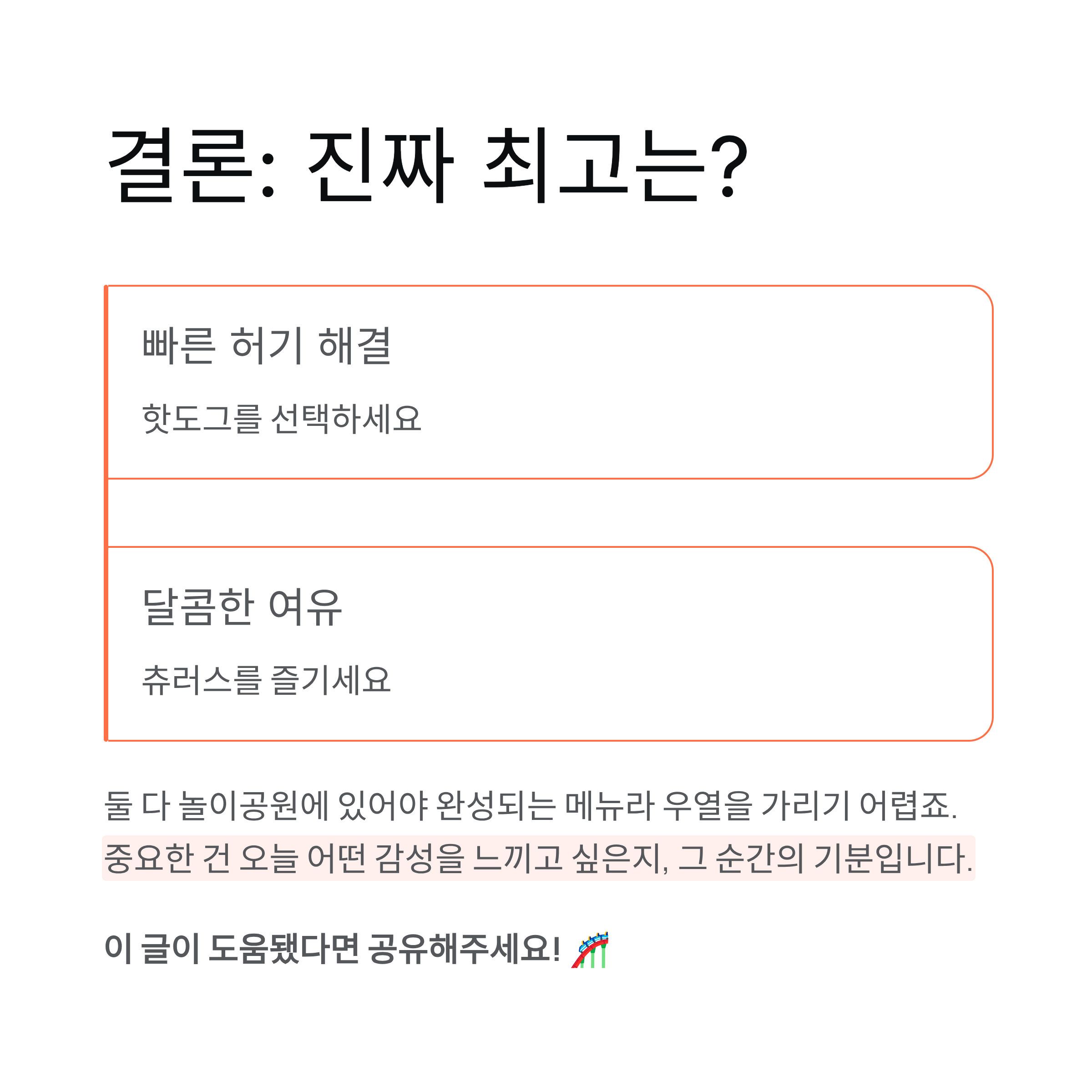 결국 선택은 취향입니다. 빠르게 허기를 달래고 싶다면 핫도그, 달콤한 여유를 즐기고 싶다면 츄러스. 둘 다 놀이공원에 있어야 완성되는 메뉴라 우열을 가리기 어렵죠. 중요한 건 오늘은 어떤 감성을 느끼고 싶은지 그 순간의 기분입니다.