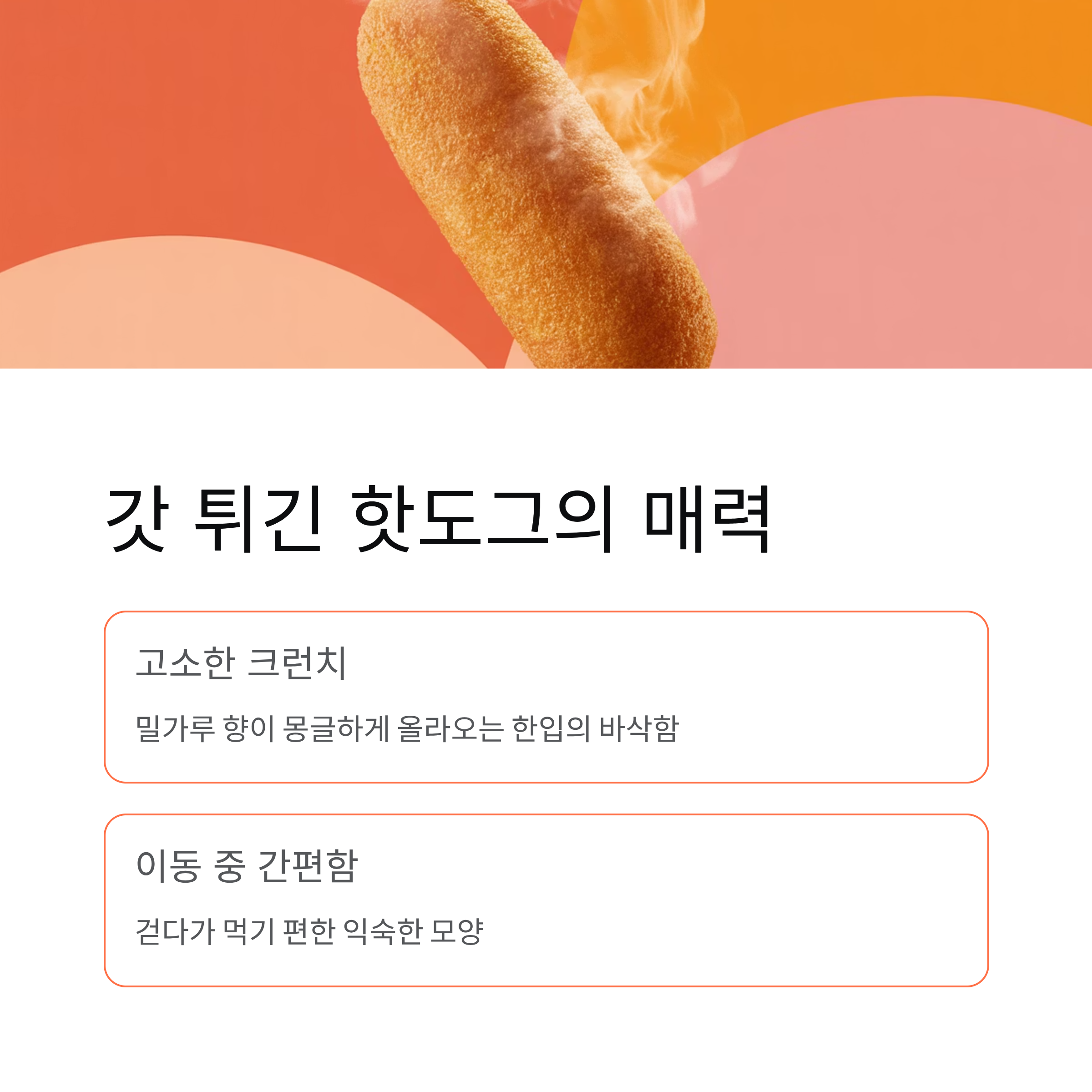 | 핫도그 | 이동하면서 먹기 좋음 | 겉바속촉 고소함 |