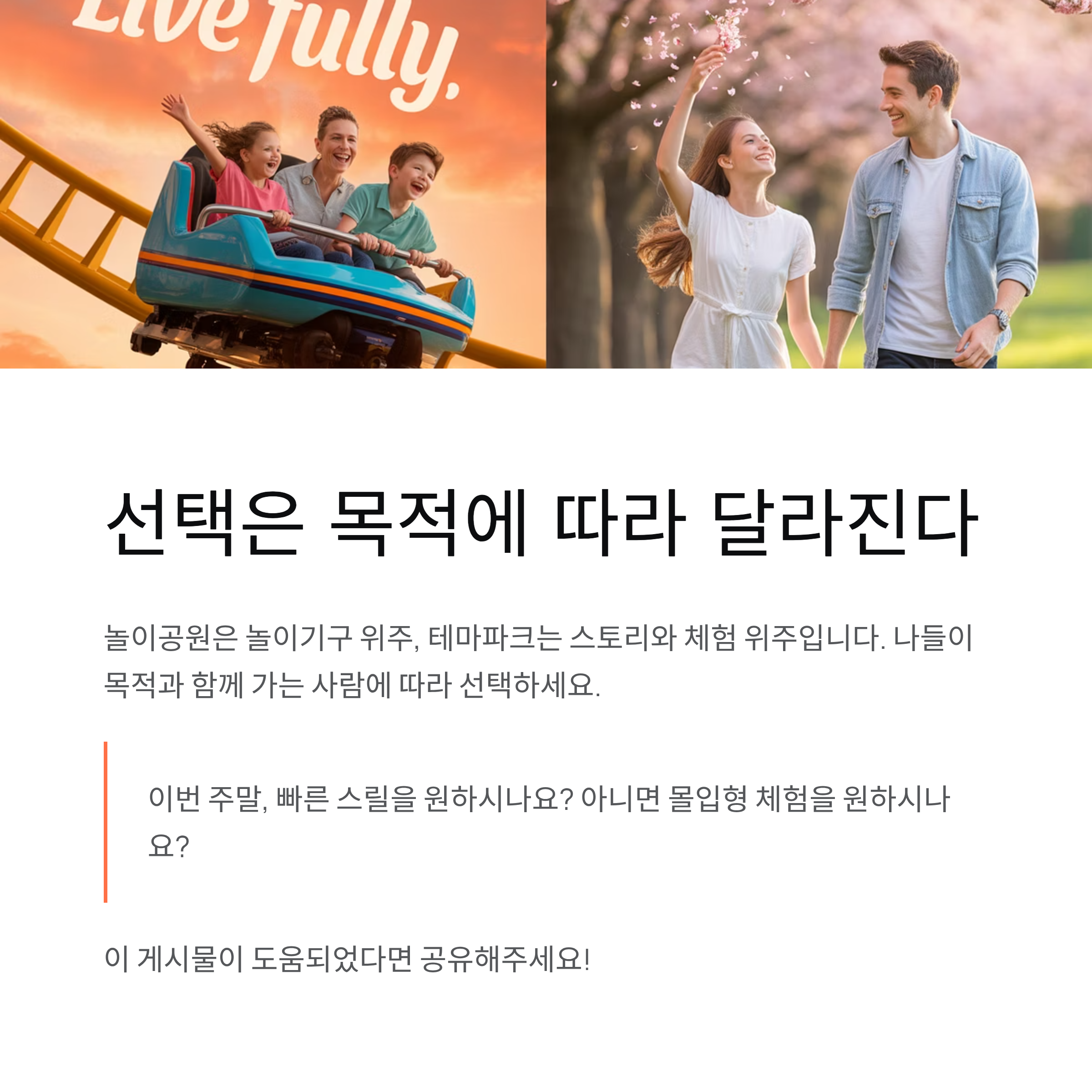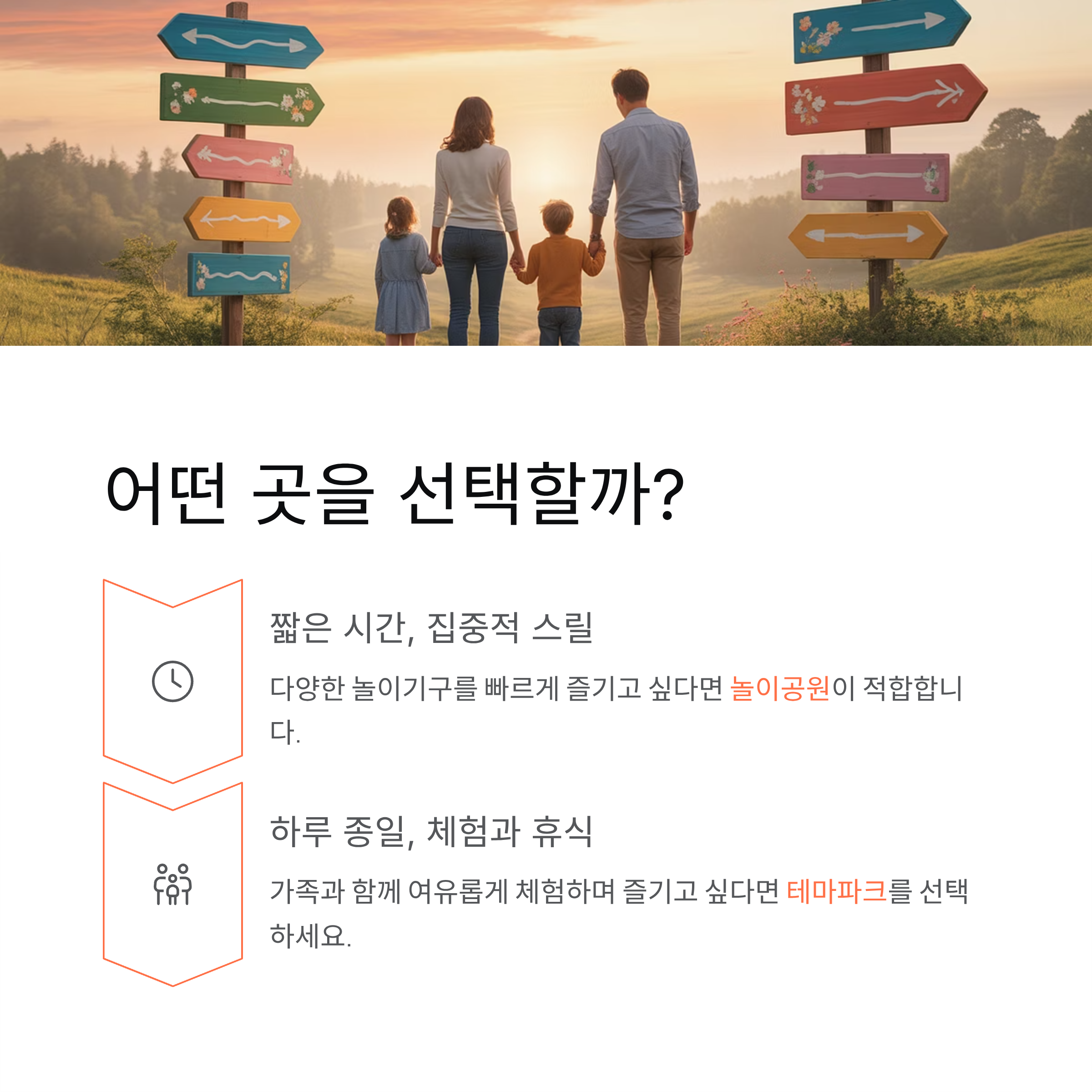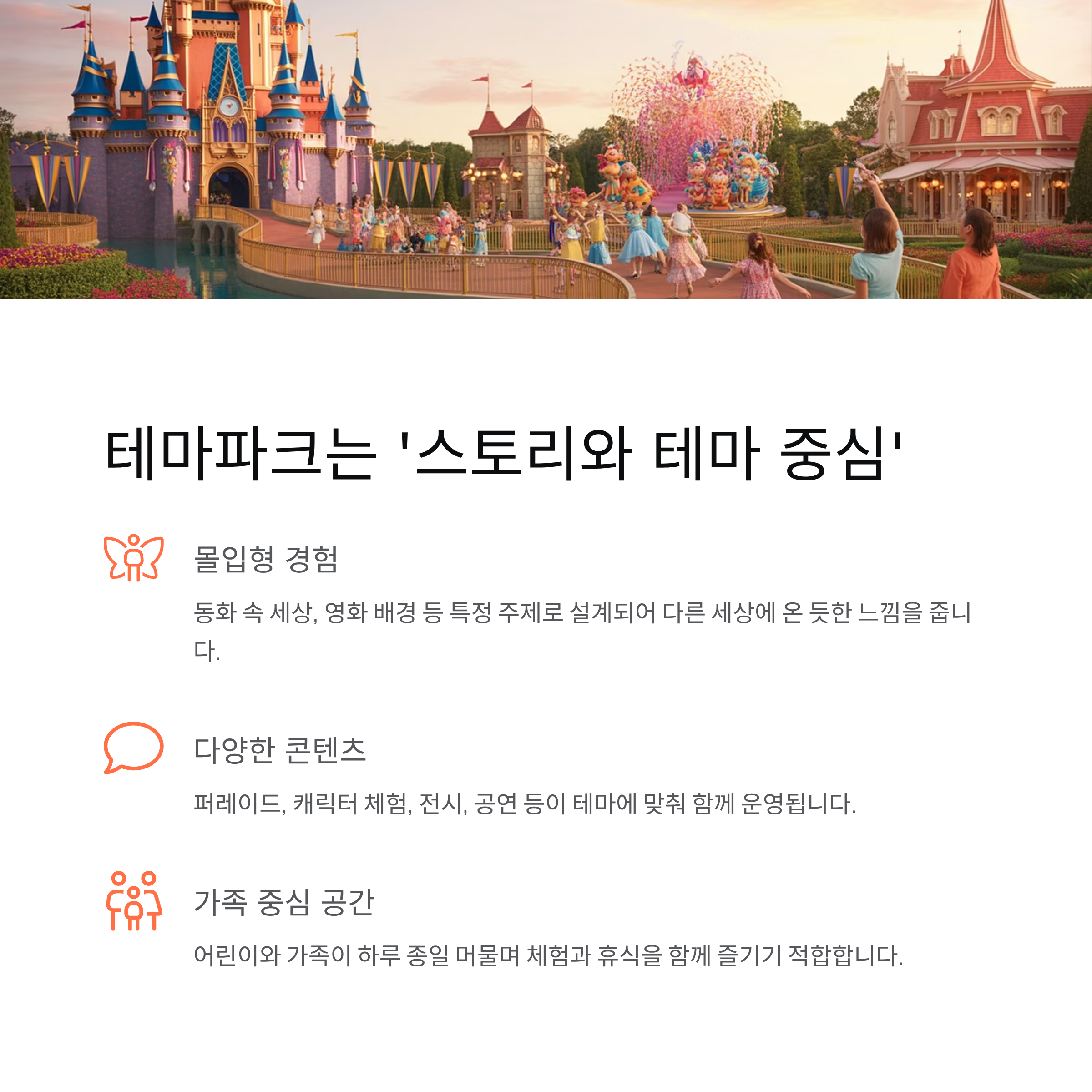 반면 테마파크는 가족 단위로 하루 종일 머물며 체험과 휴식을 함께 즐기기에 더 알맞습니다.