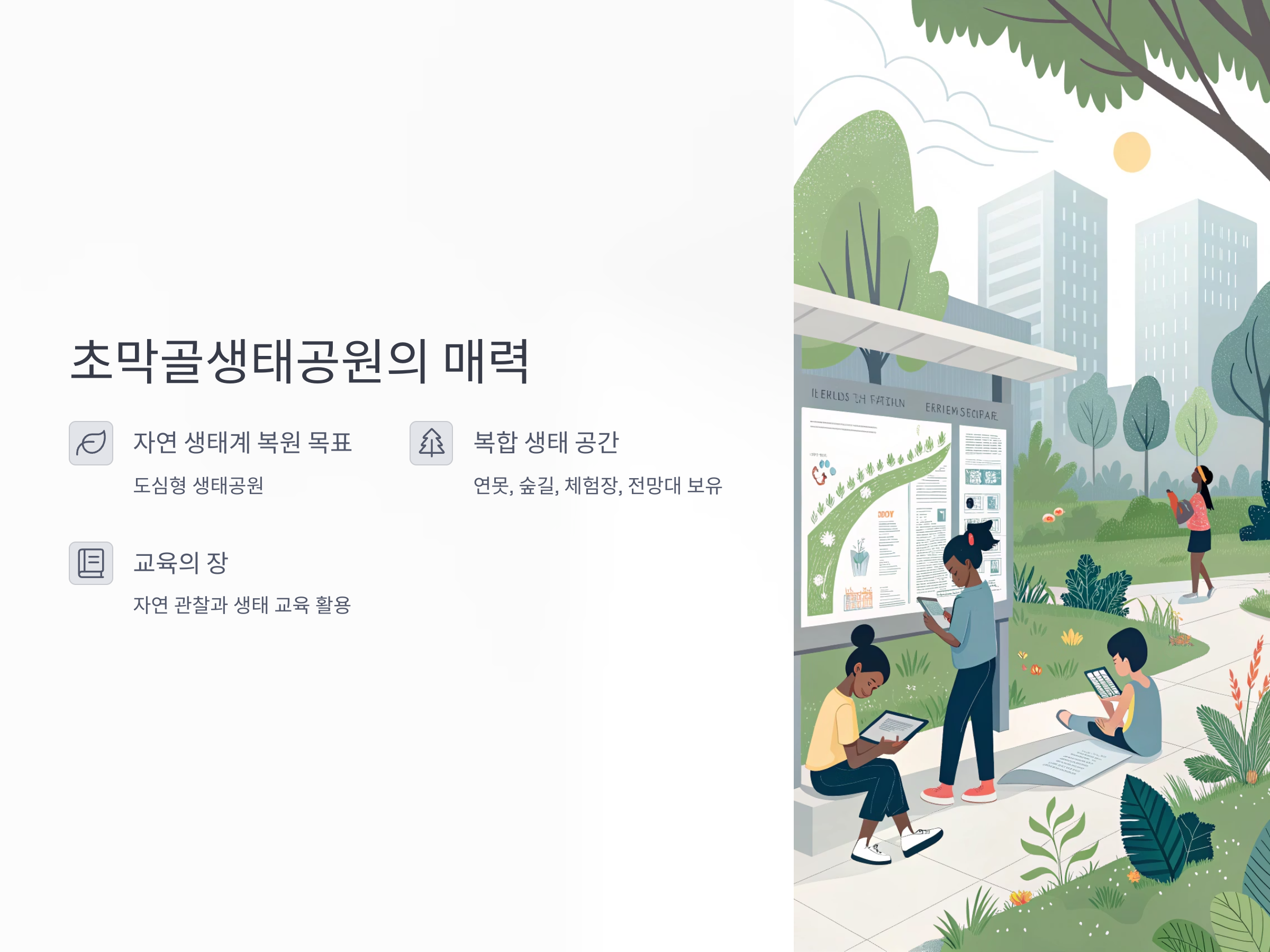 도심 속에서도 다양한 생물과 식물 군락을 관찰할 수 있어 생태 감수성과 환경 교육에 최적화된 공간입니다