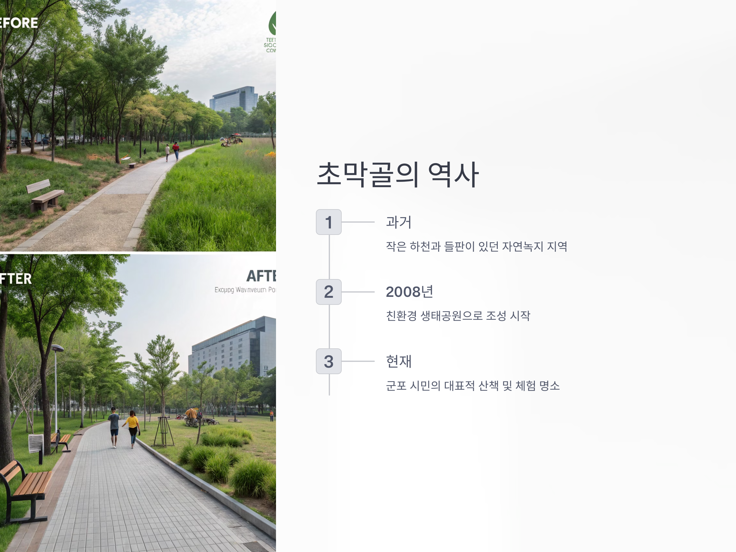 초막골은 원래 작은 하천과 들판이 있던 자연녹지 지역으로 2008년부터 친환경 생태공원으로 조성되며 현재는 군포 시민의 대표적인 산책 및 체험 명소로 자리 잡았습니다