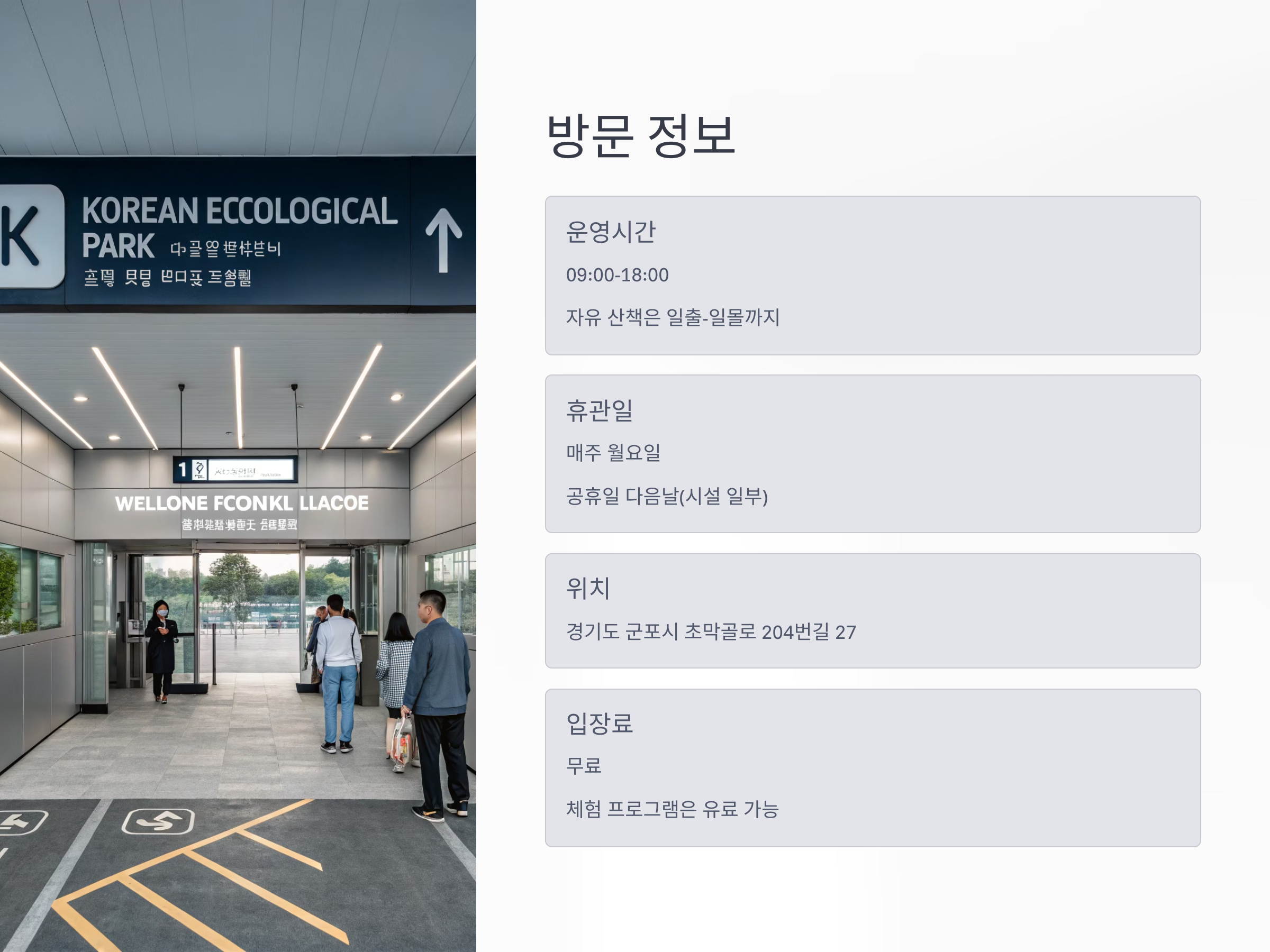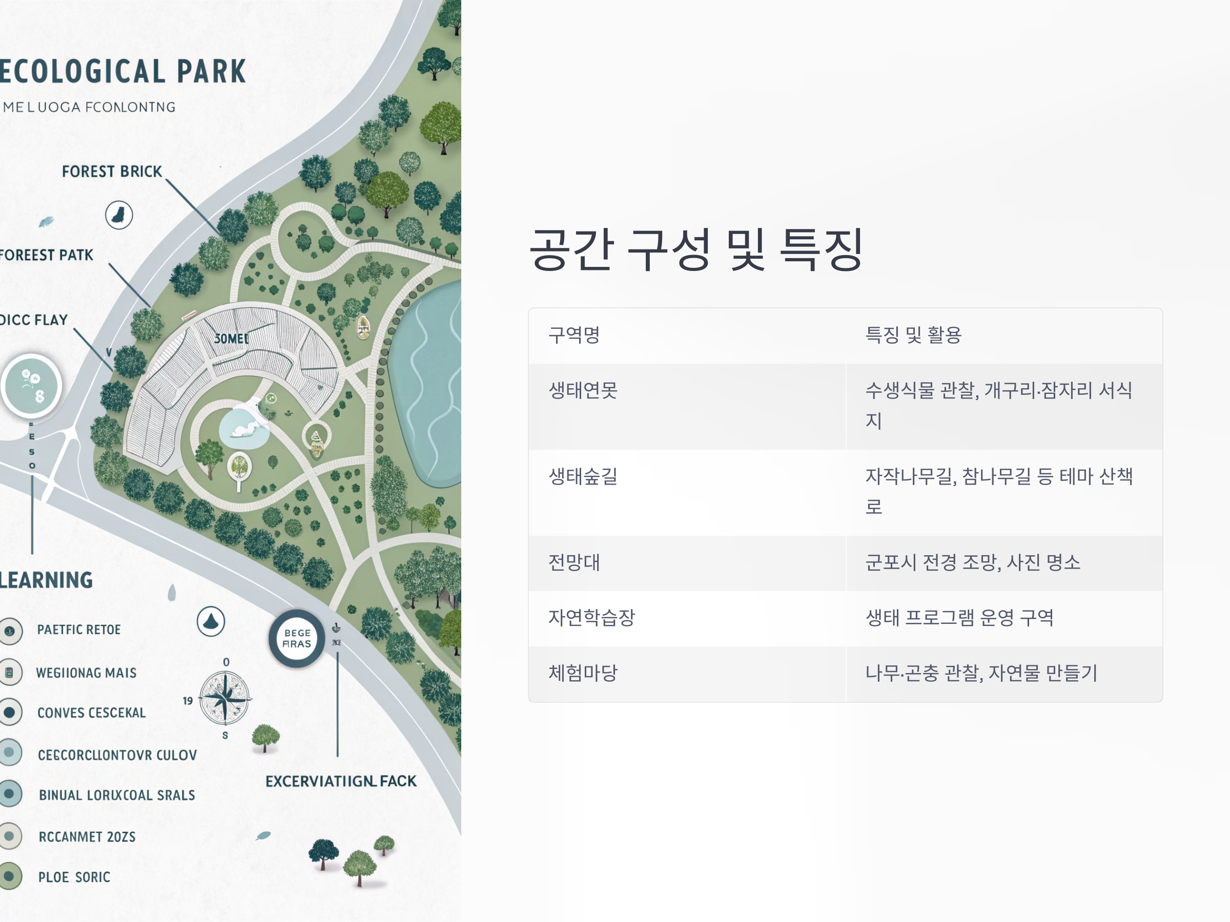 연못, 숲길, 체험장, 전망대까지 두루 갖춘 복합 생태 공간으로 가족 단위 나들이는 물론, 자연 관찰과 생태 교육의 장으로도 활용되고 있습니다.