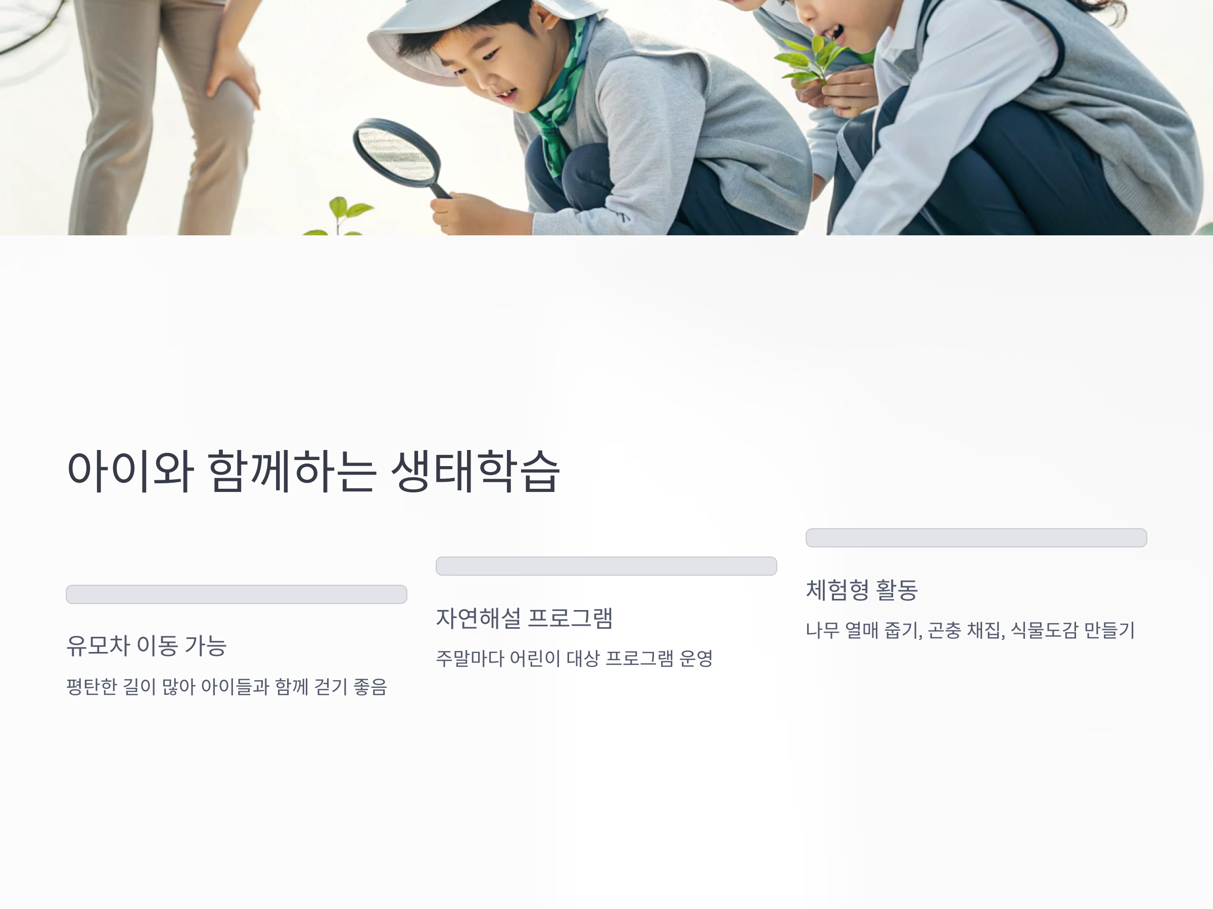 | 체험마당 | 나무 관찰, 곤충 관찰, 자연물 만들기 등 계절 체험 진행 |