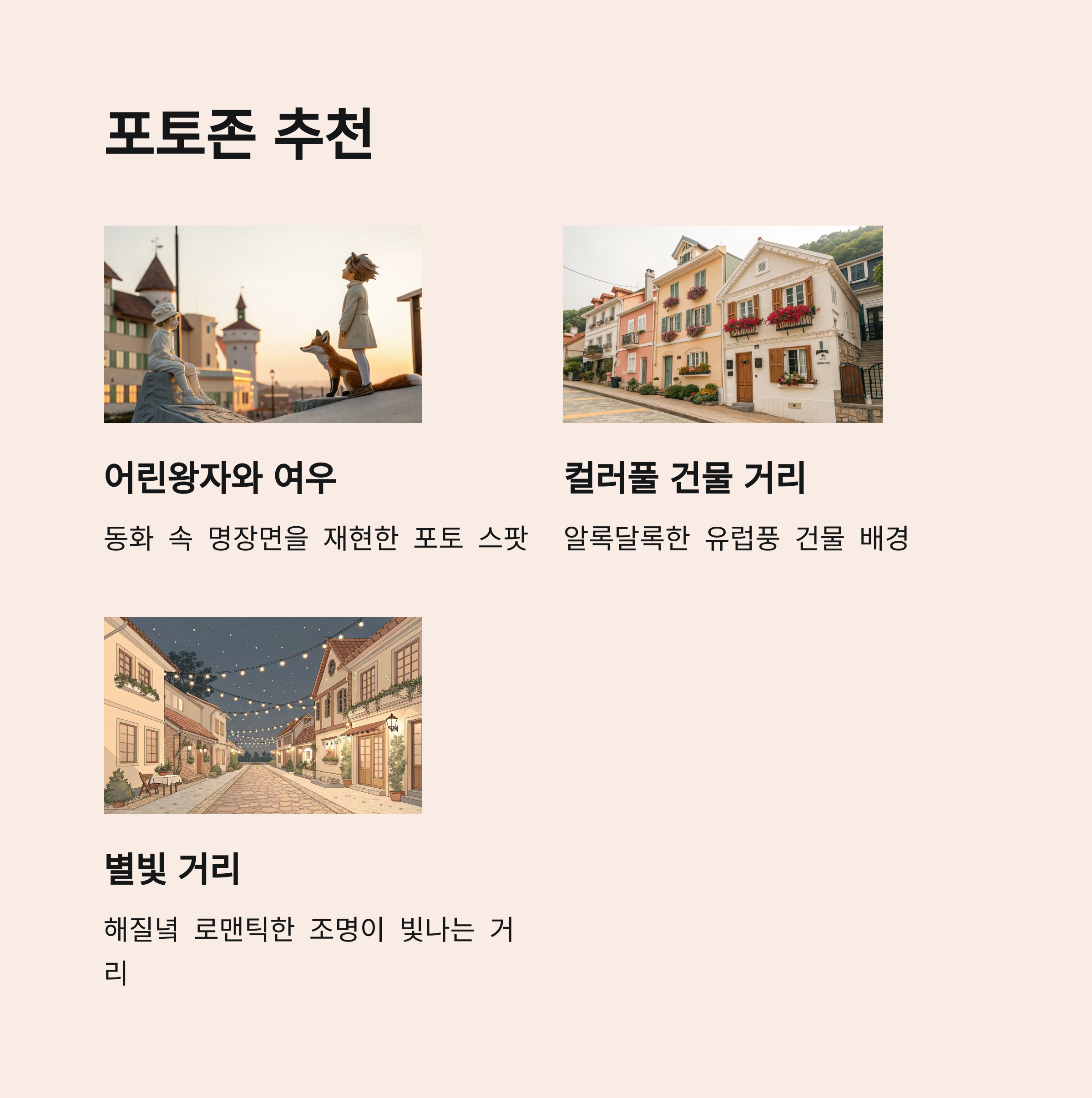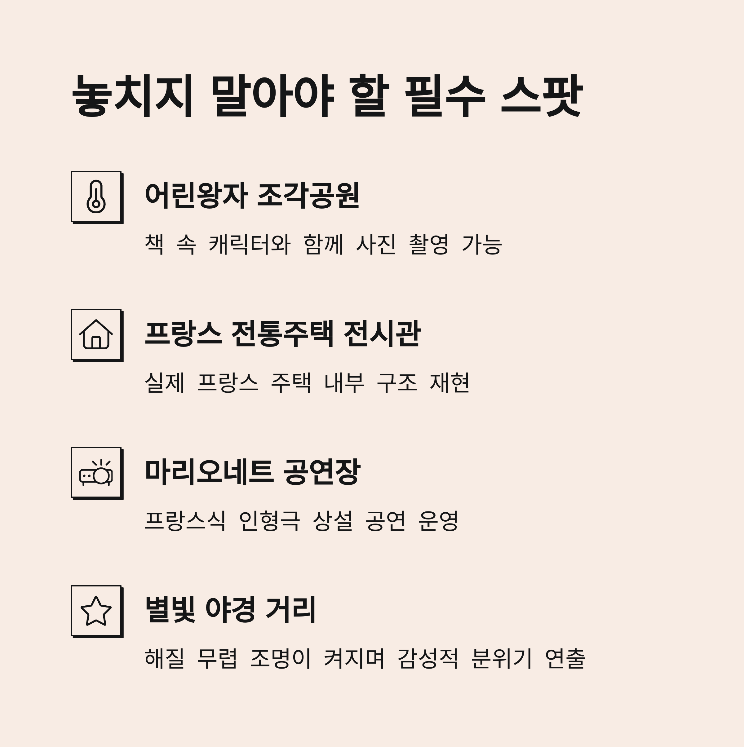 '어린왕자'의 감성을 담은 공간 구성과 유럽풍 건축물이 인상적인 여행지입니다.