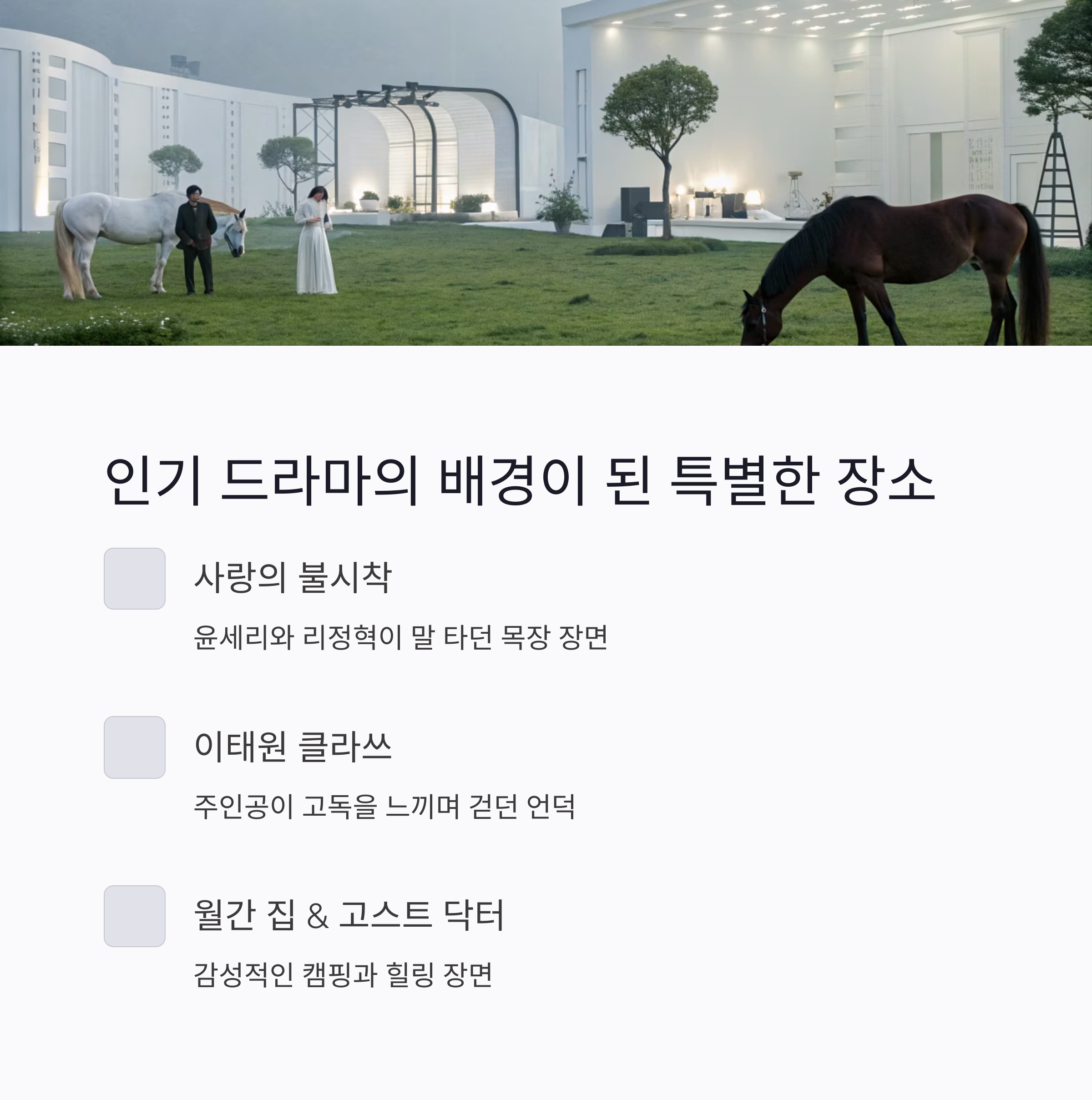 | 사랑의 불시착 | tvN | 윤세리와 리정혁이 말 타던 목장 장면 |