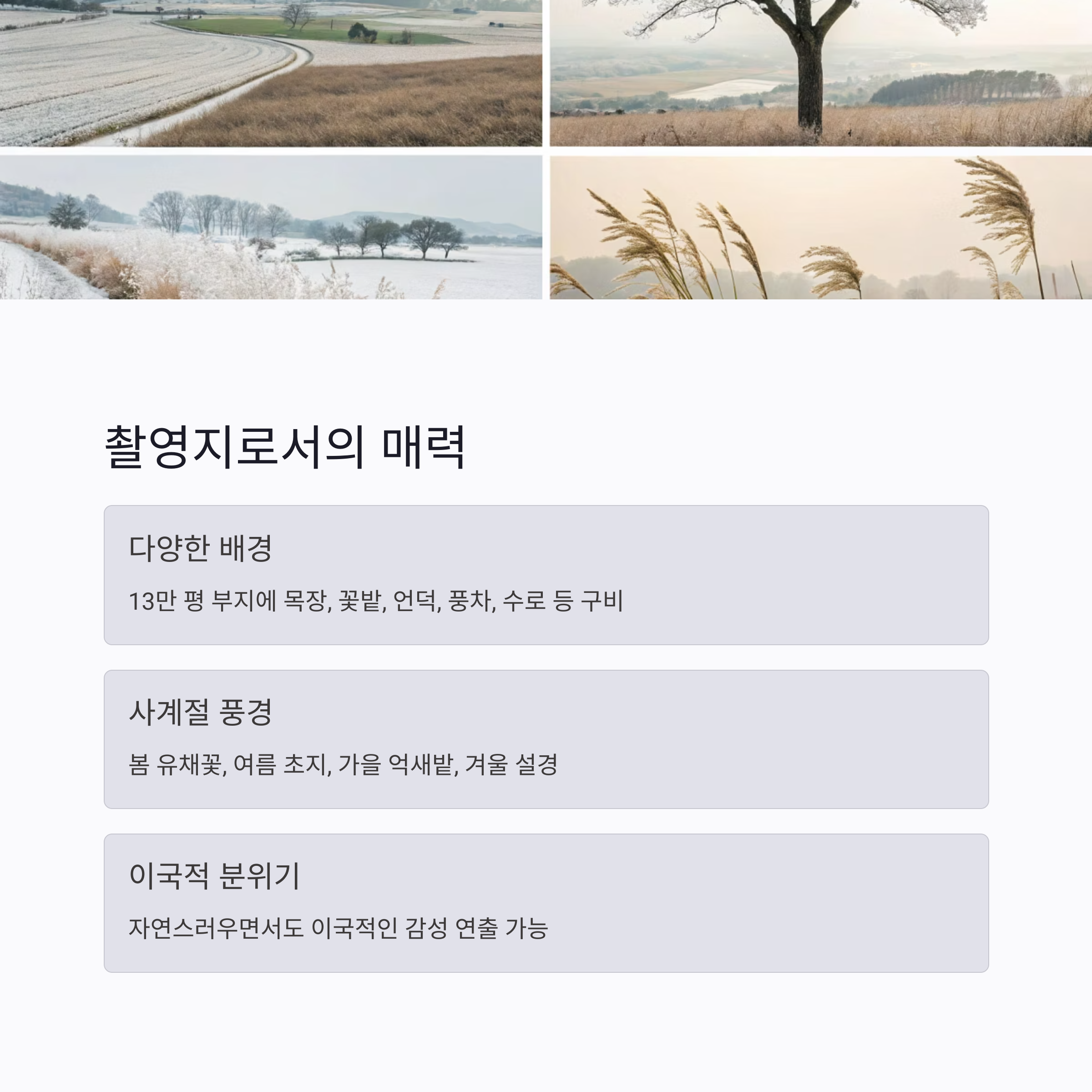 계절에 따라 풍경이 달라지기 때문에 봄의 유채꽃, 여름의 초지, 가을의 억새밭, 겨울의 설경 모두 활용도가 높습니다.