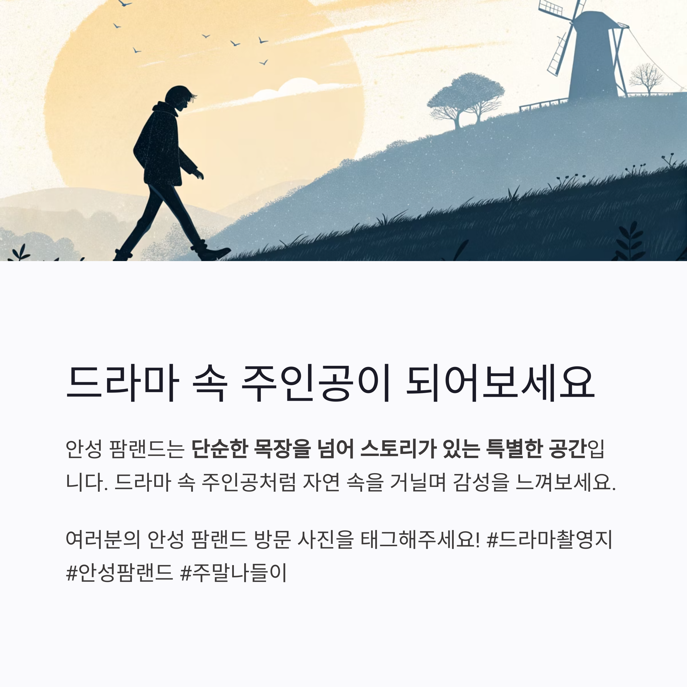 안성 팜랜드는 약 13만 평 규모의 부지에 목장, 꽃밭, 언덕, 풍차, 수로 등 다양한 촬영 배경을 갖추고 있어