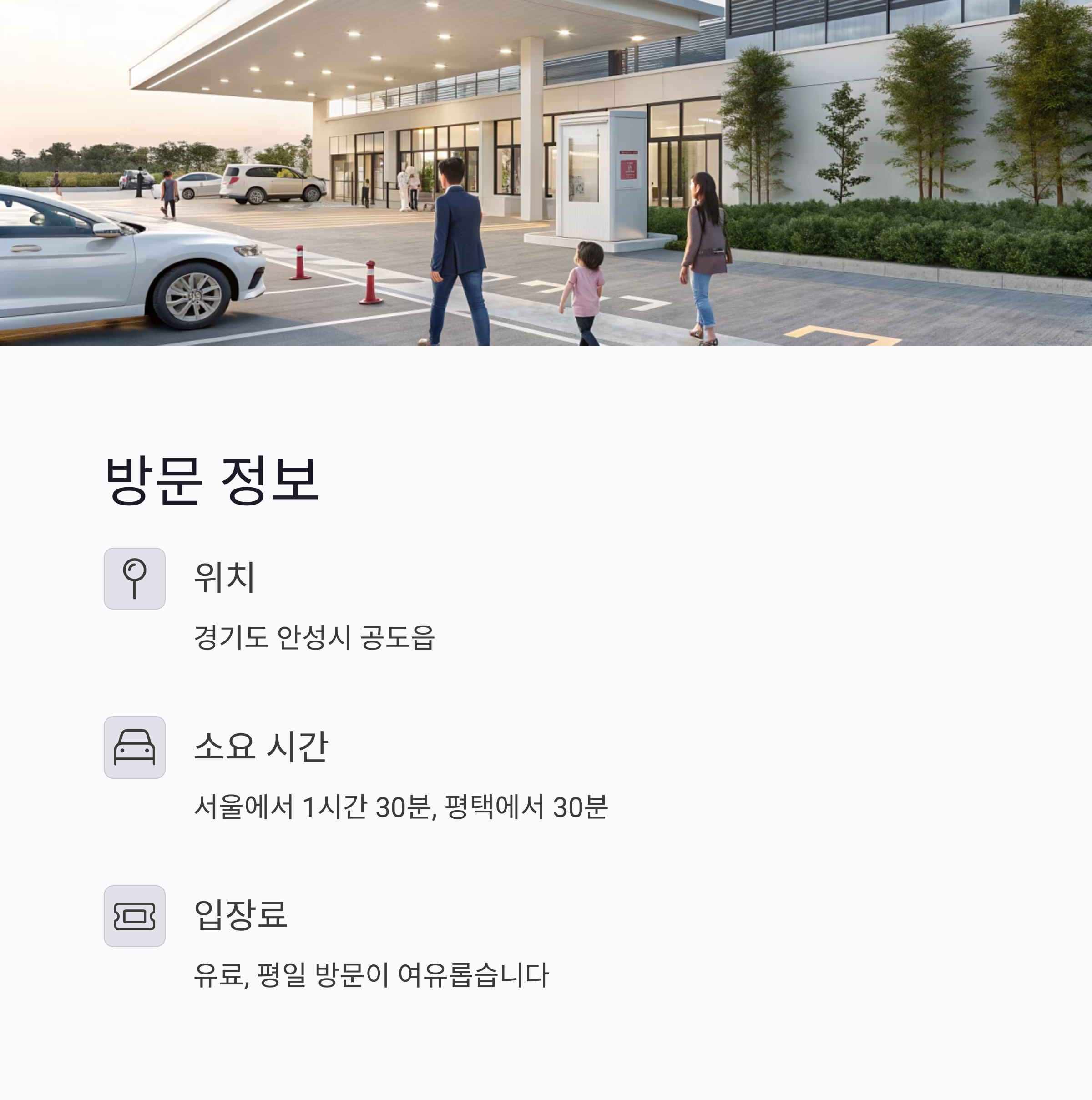 자가용 이용 시 평택에서 약 30분, 서울에서 1시간 30분 소요됩니다.