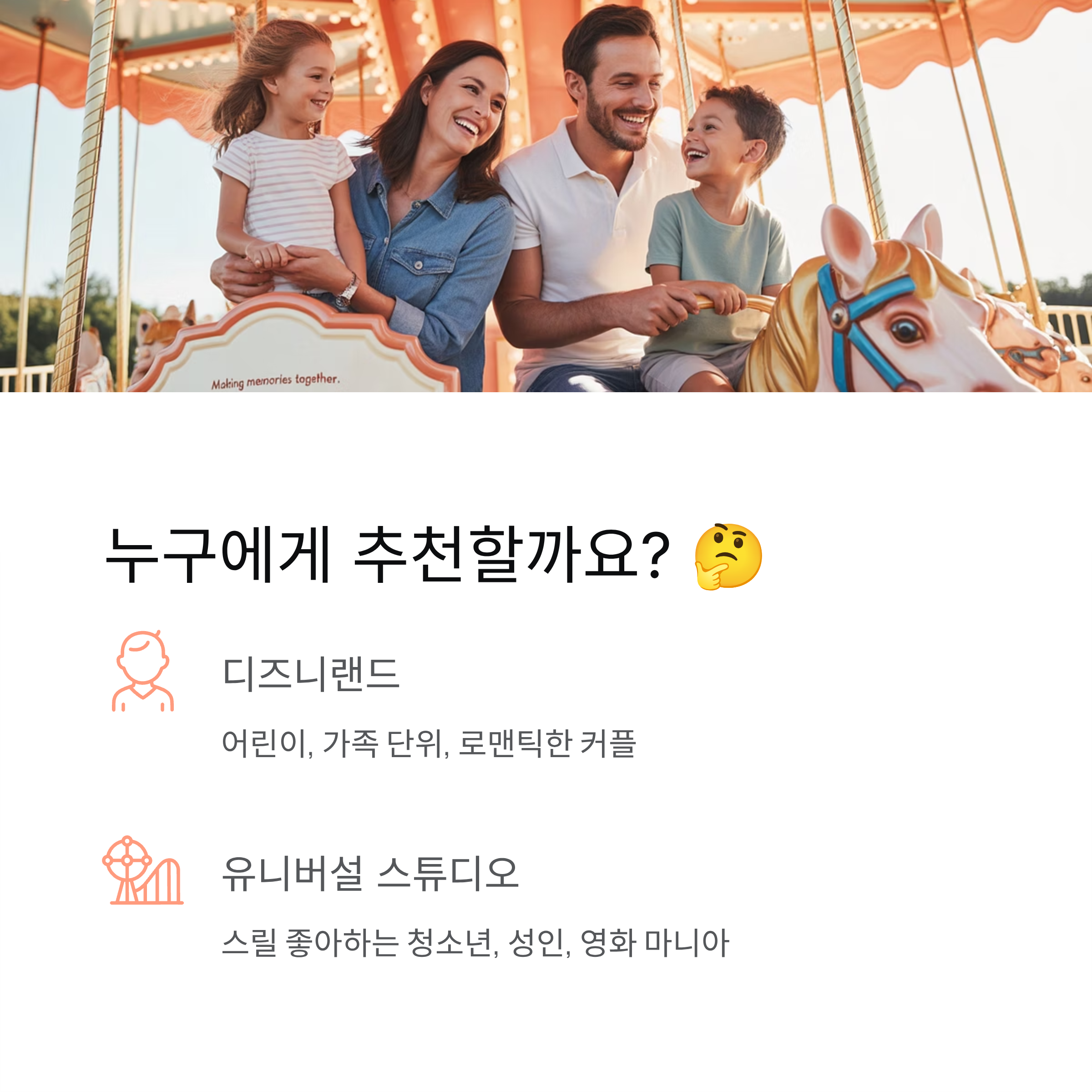 아이와 함께라면, 혹은 스릴 넘치는 어트랙션을 원한다면 선택은 달라질 수 있습니다.
